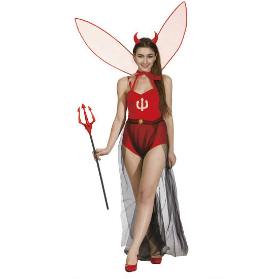 This adult costume set boasts a hot devil design in red. It features a jumpsuit, a hair band with horns, wings, and a decorative fork. This set surely is an ideal choice for cosplay games and costume parties.