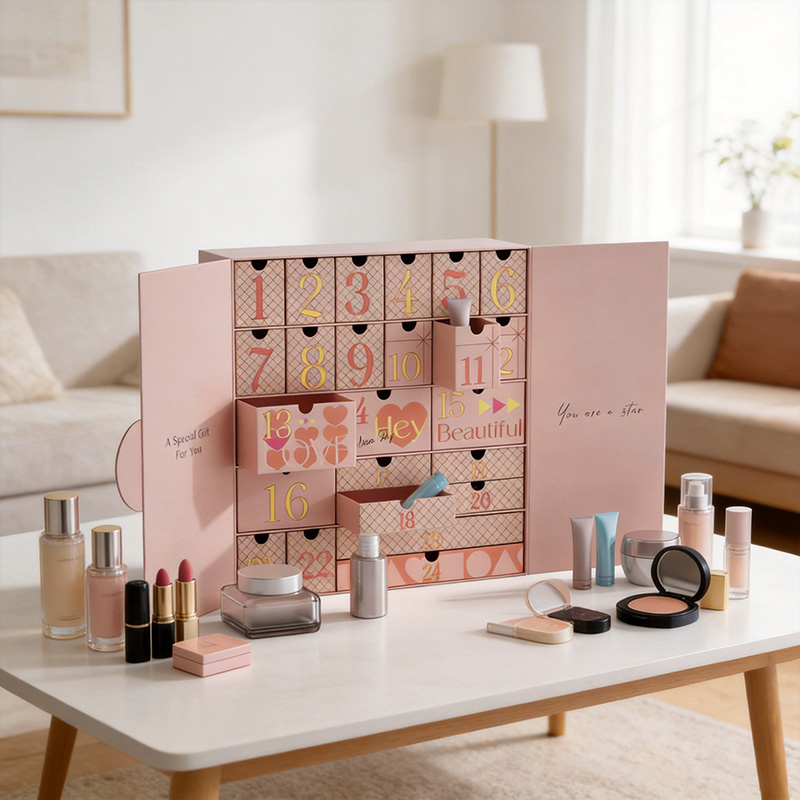 Our custom skincare advent calendar box turns skincare into a festive countdown. Our boxes are made with premium art paper and durable greyboard, enhanced by luxurious gold stamping, each of the 24 numbered drawers invites your customers to discover a new surprise. Fully customizable in size, color, and branding, this packaging is perfect for holiday promotions, influencer gift sets, or limited-edition launches.