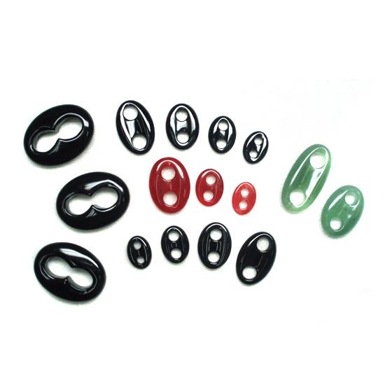 These are agate oval pieces with holes for jewellery making. They are available in black, red and green in different sizes. The pieces can also be made in other special sizes and materials upon customer's request.