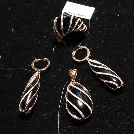 This agate jewelry set includes a pair of earrings, a ring and a pendant in gorgeous rose gold setting. Each piece is set with a mystical polished black agate. The helical strips are adorned with sparkling diamonds to grab immediate attention. Perfect your jewelry box with this distinguished jewelry set.