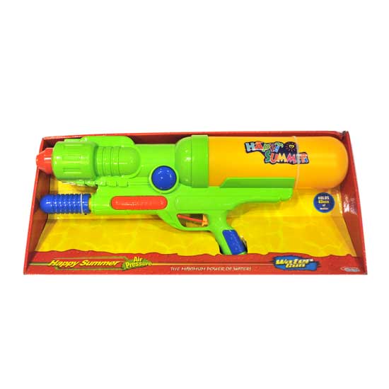 This air-pressure water gun features a green body with a yellow water tank. Equipped with a powerful air pump, the water gun can shoot water up to a long distance. The great water gun is a staple summer-time toy for children.