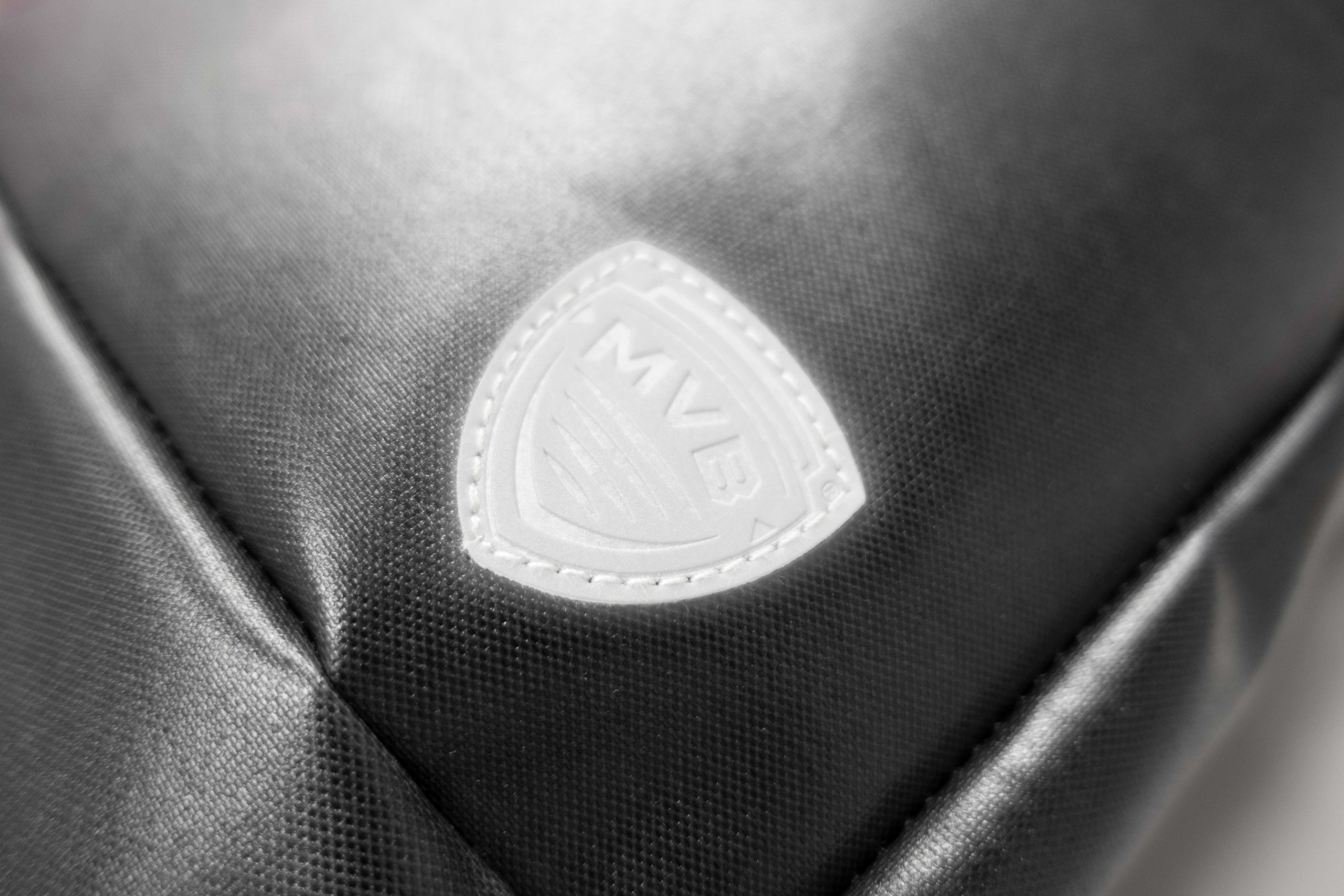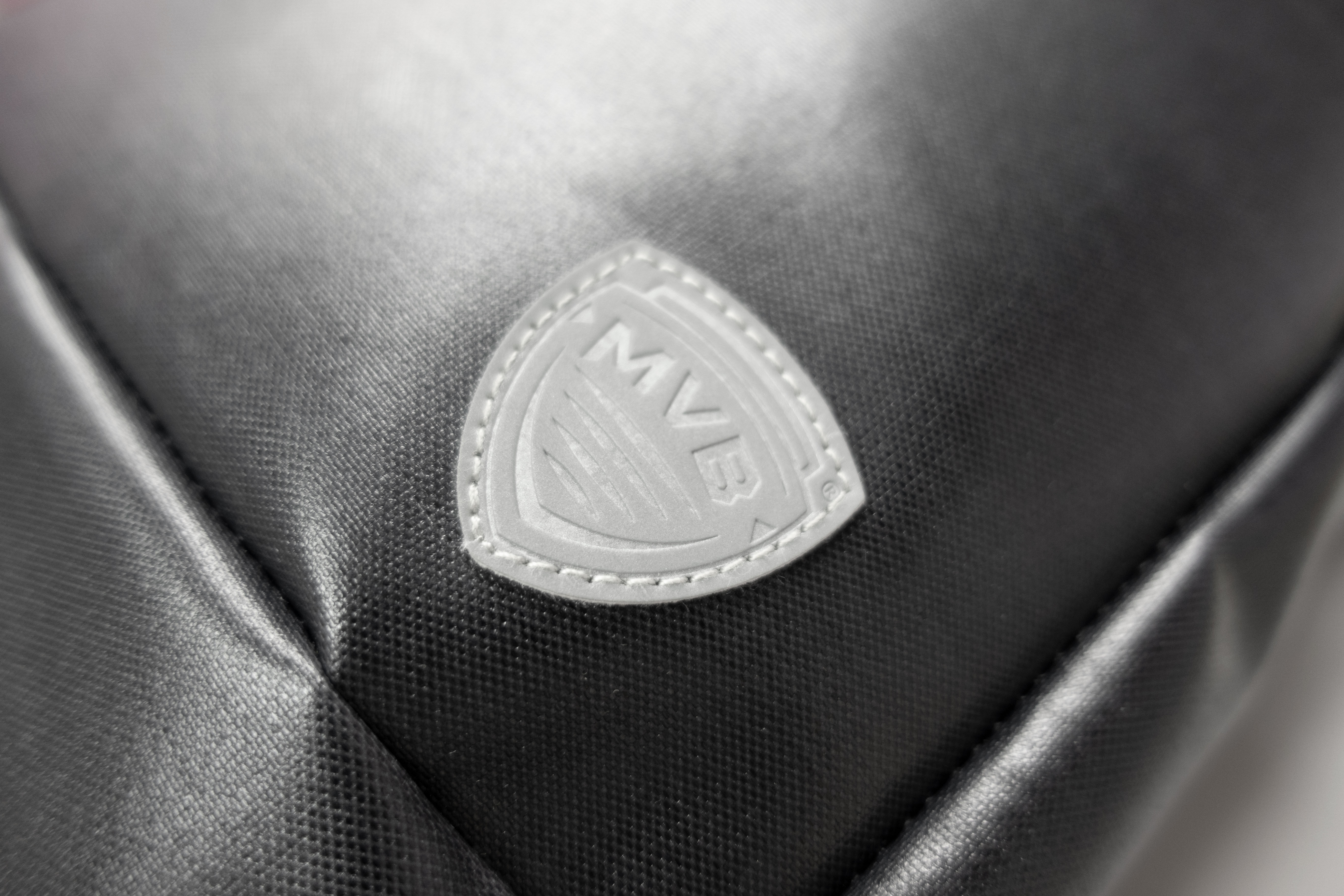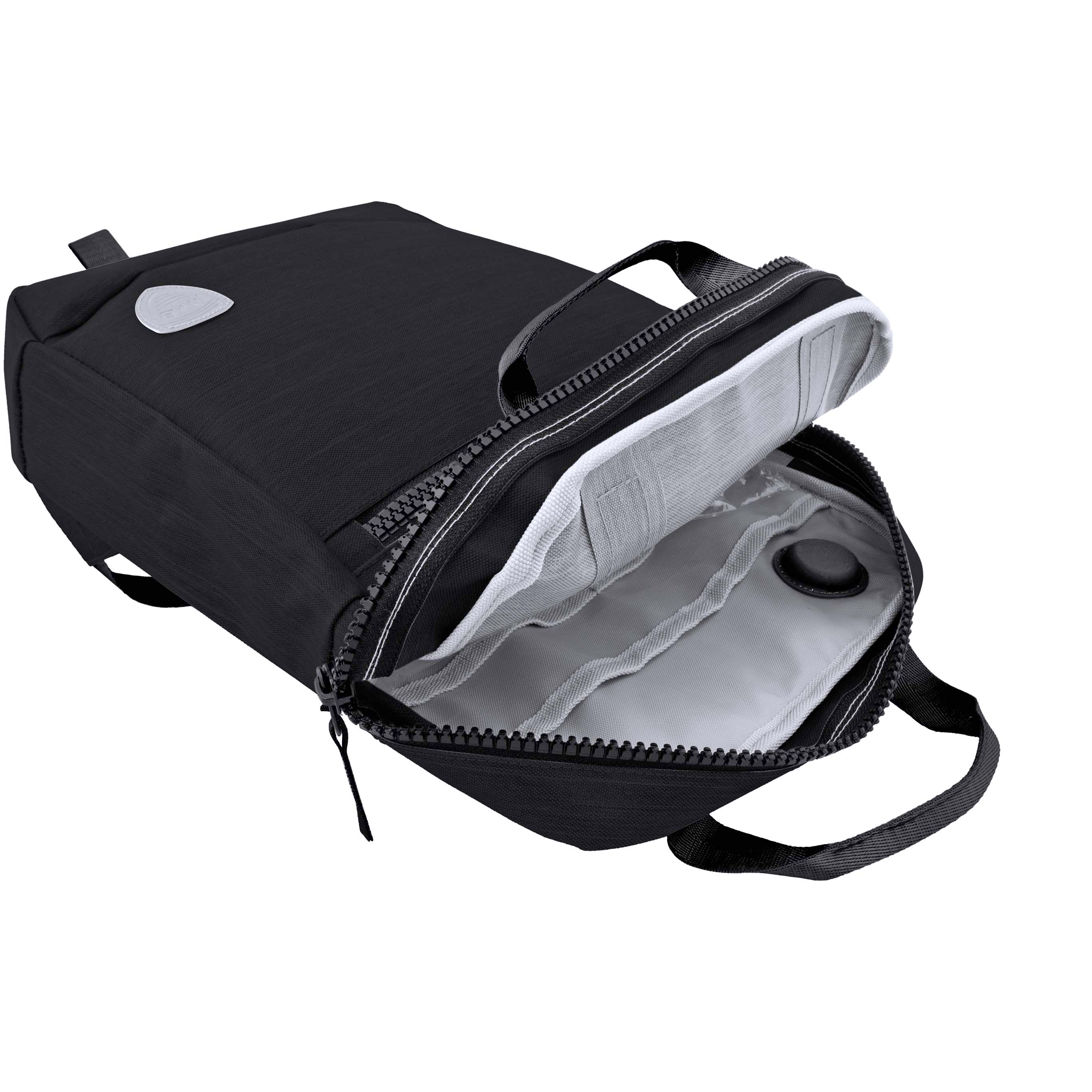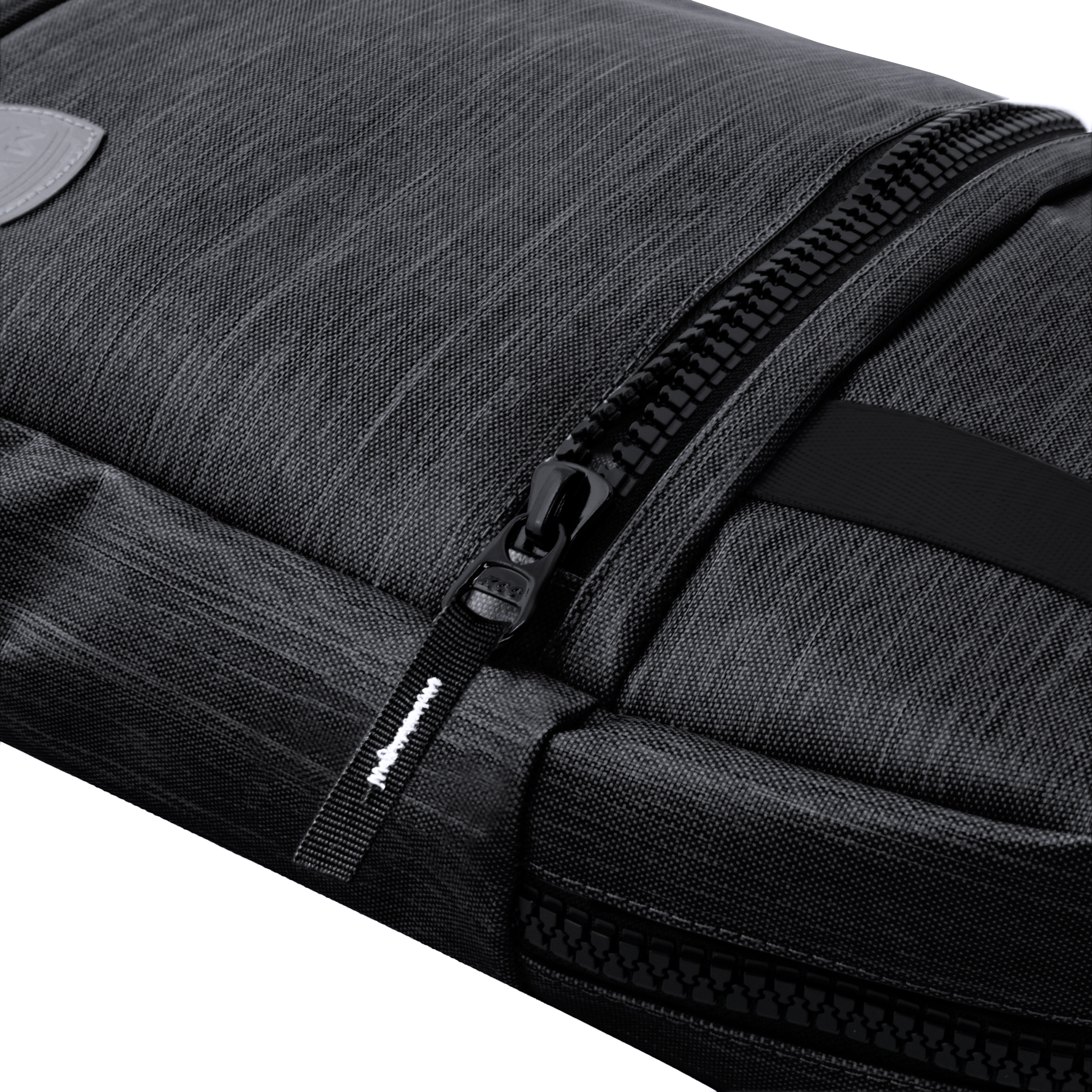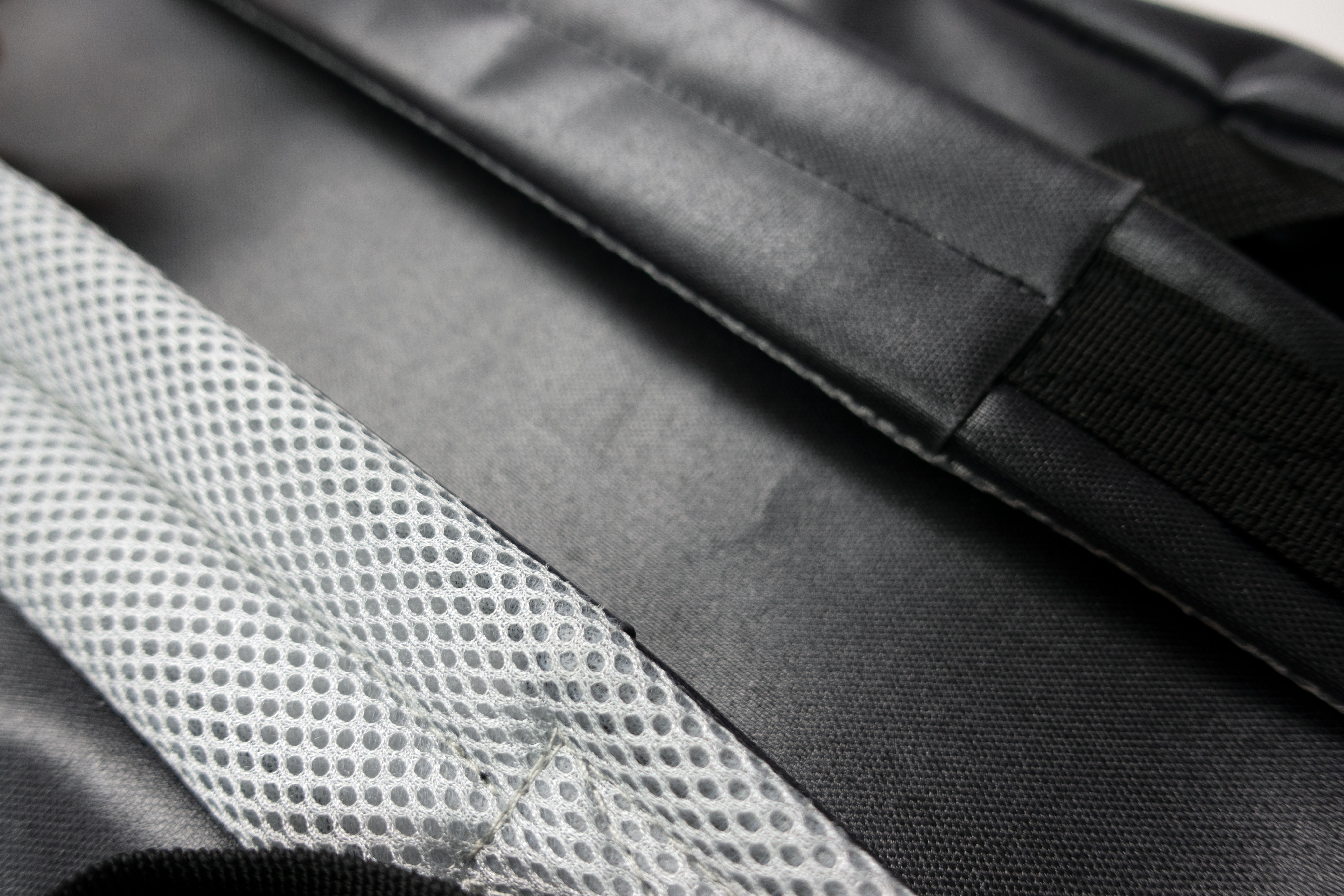 Bold, smooth zipper. Tote bag style double handles. Padded adjustable shoulder straps.