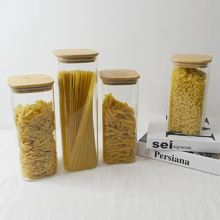Airtight bamboo quad glass storage jar set and borosilicate glass food canister with sealing bamboo lid for pasta,oats