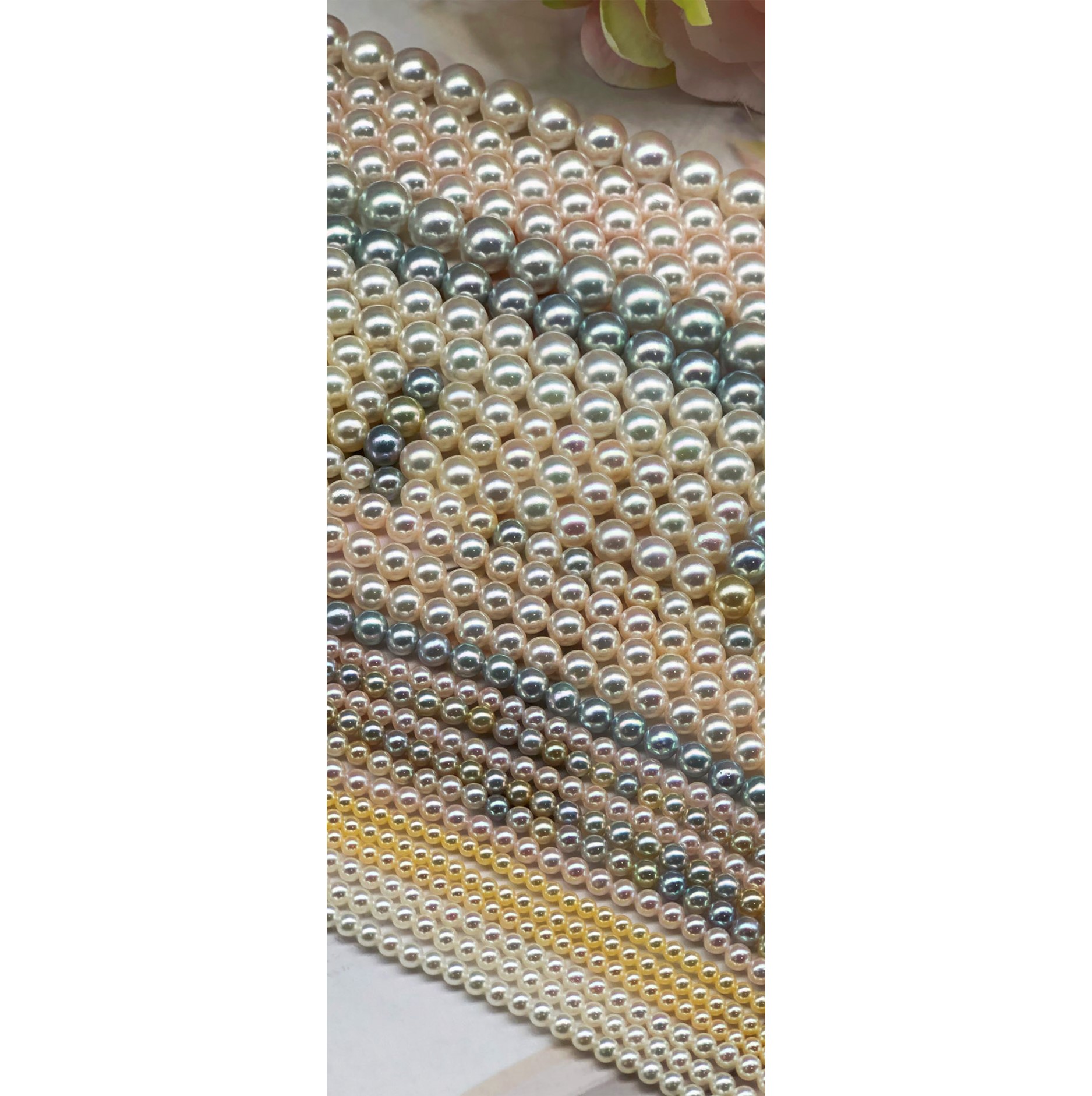 The multiple colours of Japanese Akoya pearl necklace from baby size to 10mm up with certificates