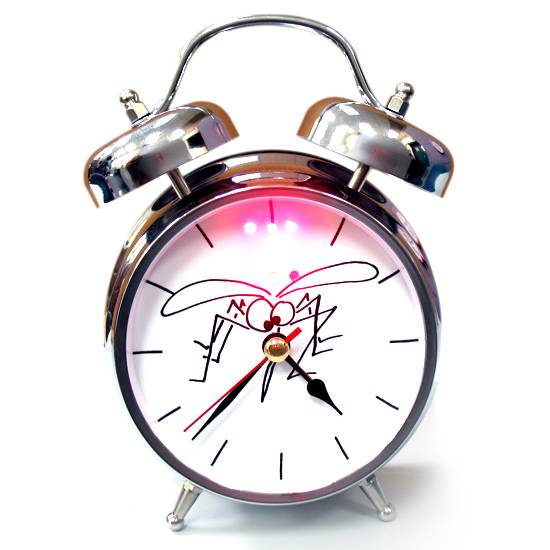 This is an analogue watch that has a picture of a mosquito. It is battery operated and has twin bells for alarming. It is cute and simple. The LED lights enables users to know the time clearly.