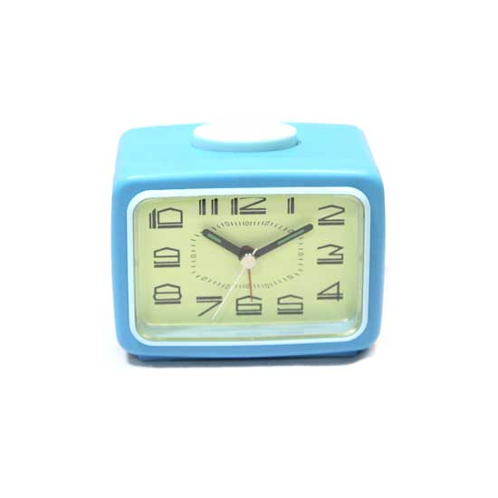 This alarm clock is designed in a rectangular shape with a blue housing. It features a light yellow dial with artistic black Arabic numbers and stick markers. In a compact size, this alarm clock is suitable for both home and travel use.