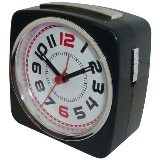 This is a table clock coming with a compact square-shape casing. The glossy black case makes a perfect match with the white dial. The clock comes with an alarm with a snoozing function.