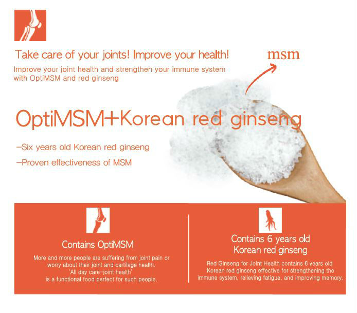 - Main ingredients : OptiMSM, 6-year-old Korean red ginseng, Glucosamine, etc.