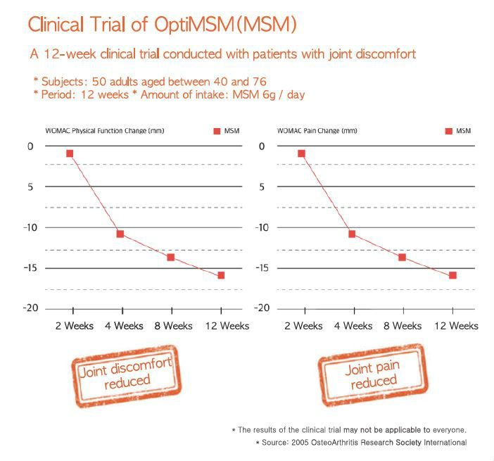 It is the best joint capsule, designed to show the joint-nourishing effect of OptiMSM which is organic sulfur, a gift from nature and the latest found ingredient obtained among main constituents of human body, is refined in the purest way and the verified rheumatoid arthritis-healing effect of 6-year-old red ginseng at the same time.