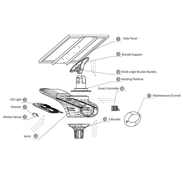 11.Adopting a new technology which includes charging manament of MPPT ( Maximum Power Point Trackng),new optimized light distribution scheme and multi platform wirelss control system, porviding a flexible solution for the management of street lamp.customization of 12.working mode and remote real-time control.