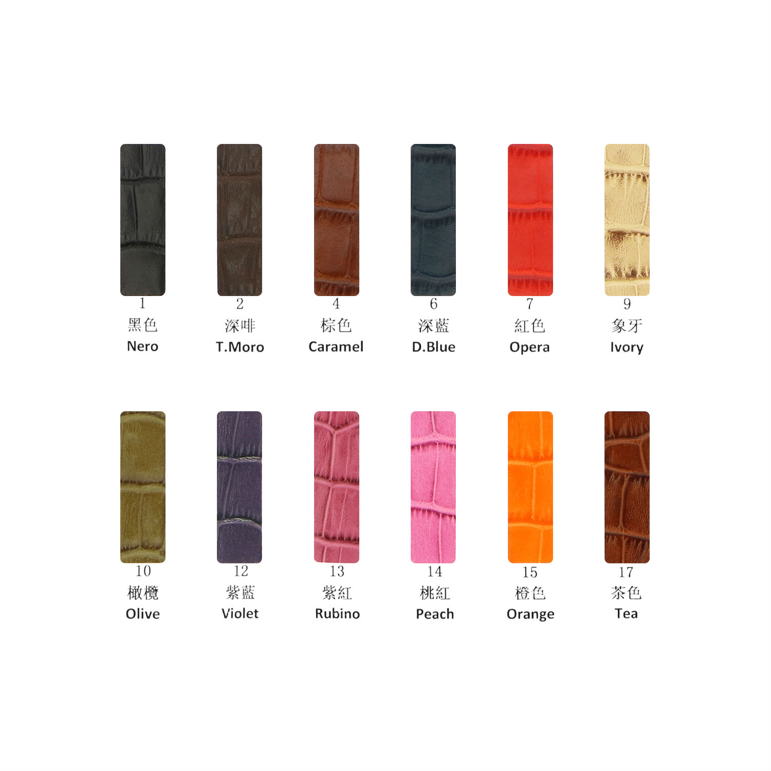 - Comes in twelve colors, including Nero, T.Moro, Caramel, D.Blue, Opera, Ivory, Olive, Violet, Rubino, Peach, Orange and Tea.