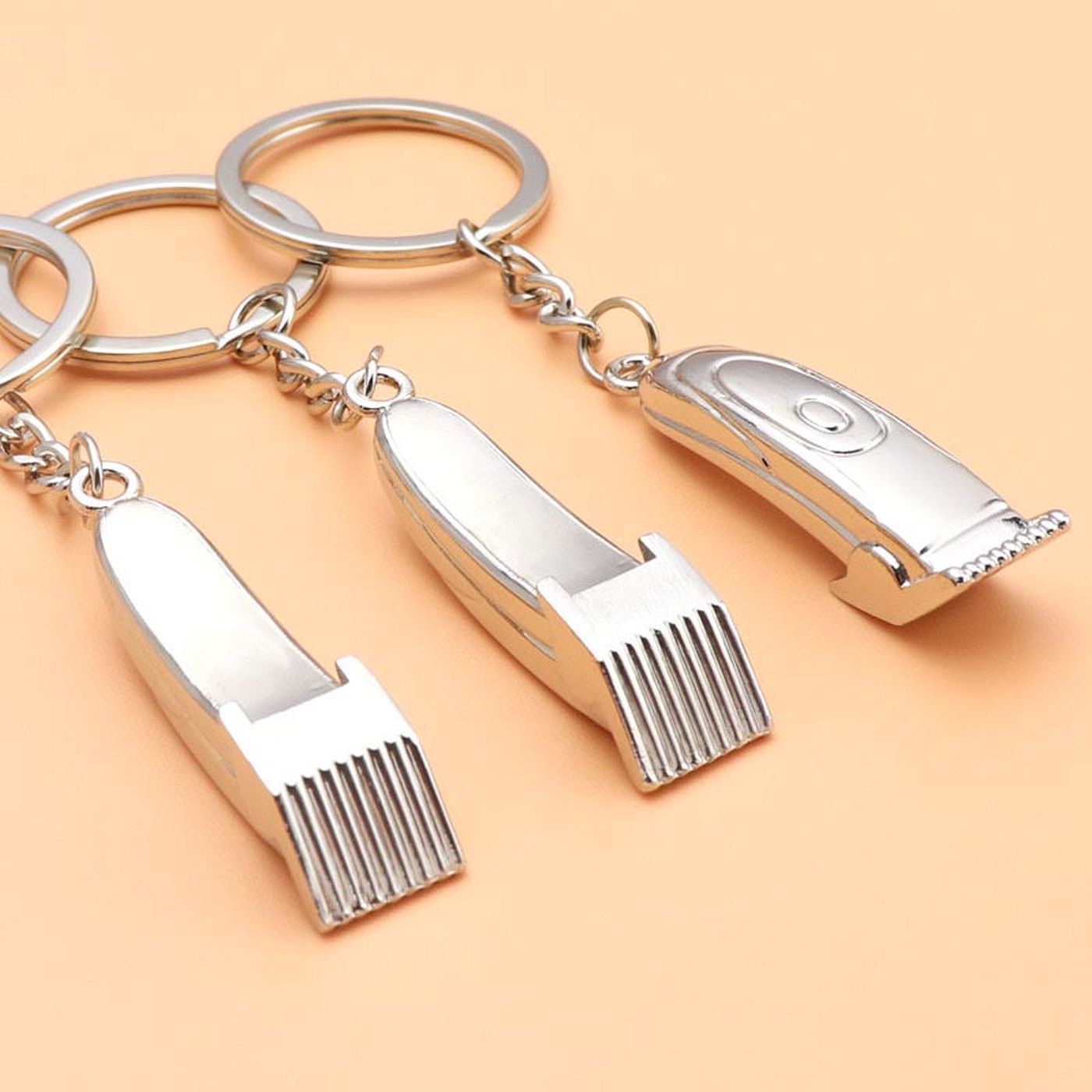As shown is a high-fashion haircut tool pattern silver plated key chain.