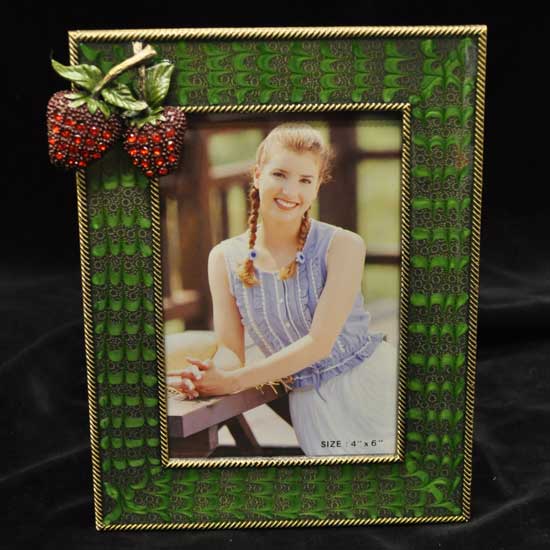This coveted pewter zine alloy photo frame stands as a vertical rectangle with a dense wavy pattern. The stylish photo frame comes with a glittering strawberry embellishment at the top corner. House your precious photo with the botanical beauty.