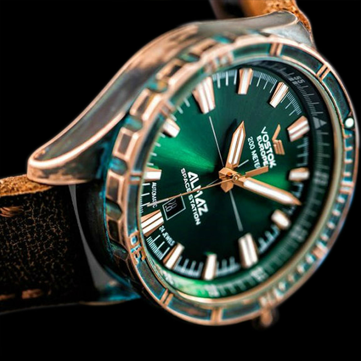 Don’t miss out this automatic watch if you happened to be a retro watch person. This watch comes in a round bronze case in patina finish, which leaves the textured bezel a nostalgic, faded-paint design. Encasing an Almaz green sunray dial, this watch looks truly one-of-a-kind. Rounded off with a vintage strap with contrast stitches, this indelible timepiece instantly falls into the watch collectibles category.