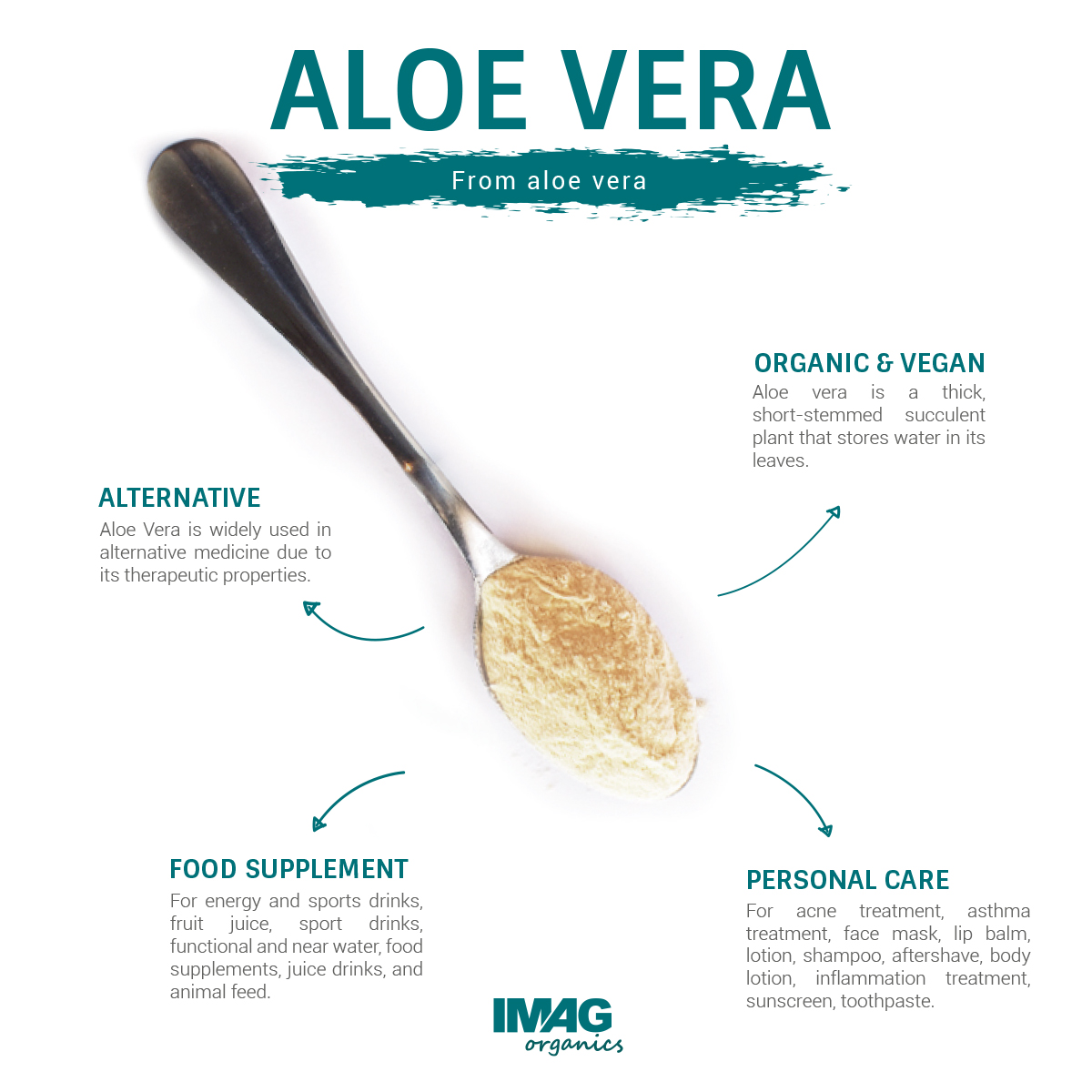 Alo Vera is widely used in alternative medicine due its therapeutic properties. I can be employed as an ingredient and/or raw material in food supplements for humans and animals, beverages, personal hygiene products, cleaning products, pharmaceuticals, and cosmetics, and as an ointment for minor burns and sunburns.