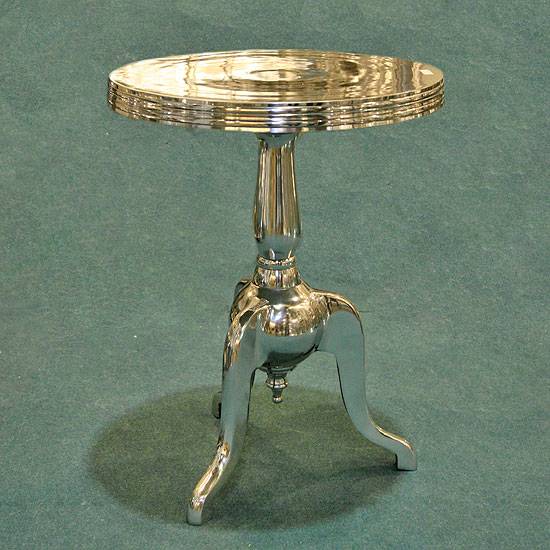 The furniture shown on the picture is an aluminiium coffee table with a three-leg stand. The round table has a highly polished and sleek appearance, which is an elegant and high-end furniture for your living room or garden.