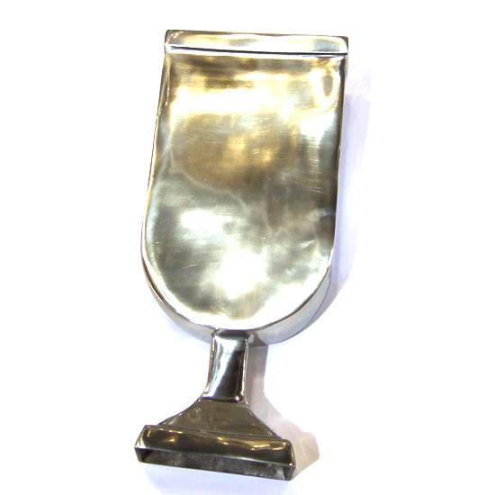 This is a flower vase made of aluminium. This handmade vase is shiny polished and resembles the shape of a wire glass. It can stand firmly on any flat surface while holding several flowers.