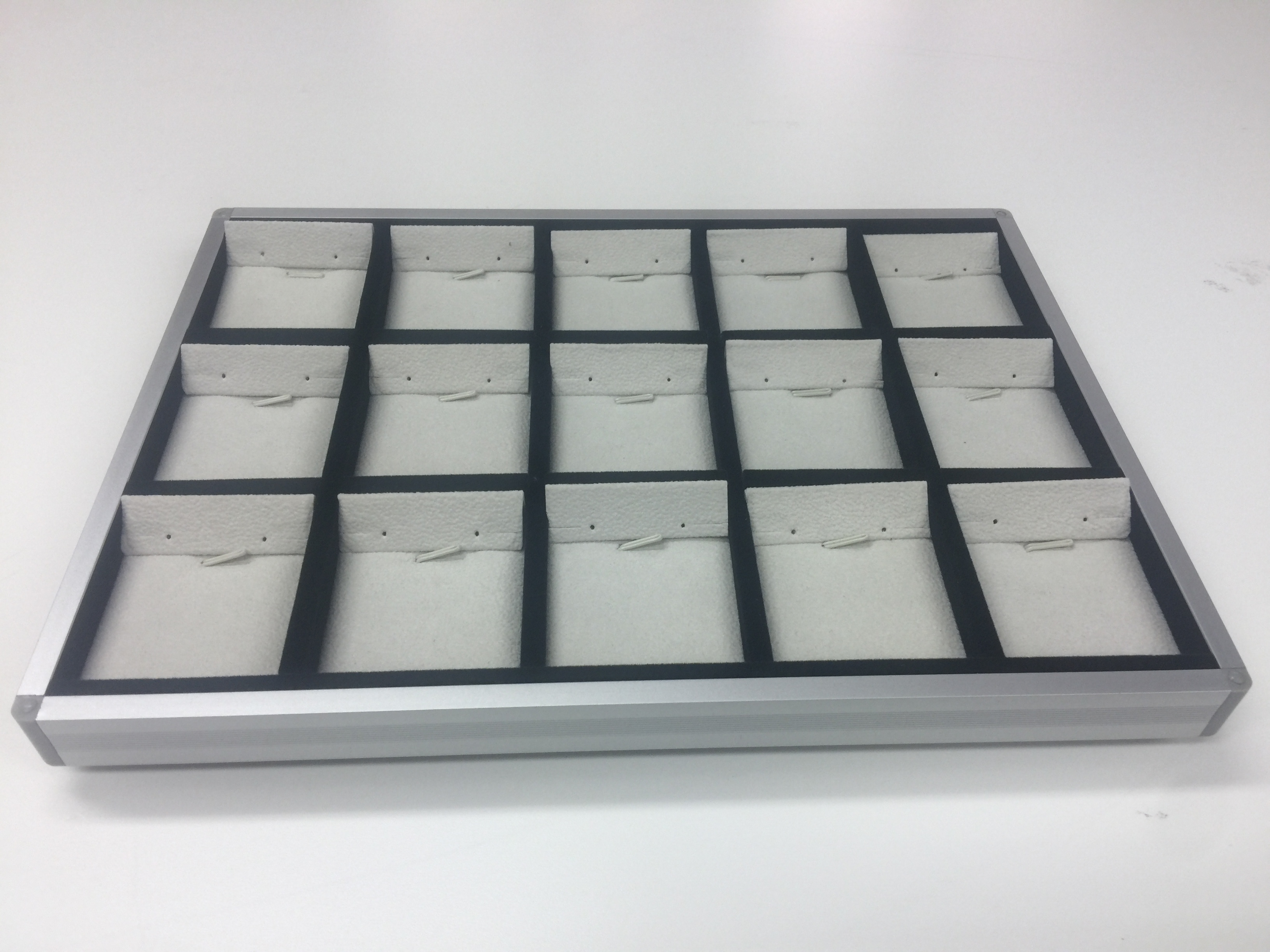 - A display tray with a total of fifteen compartments in three rows.