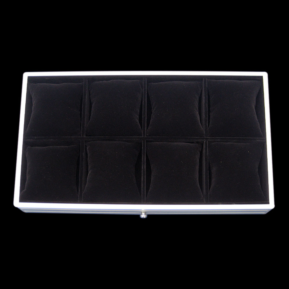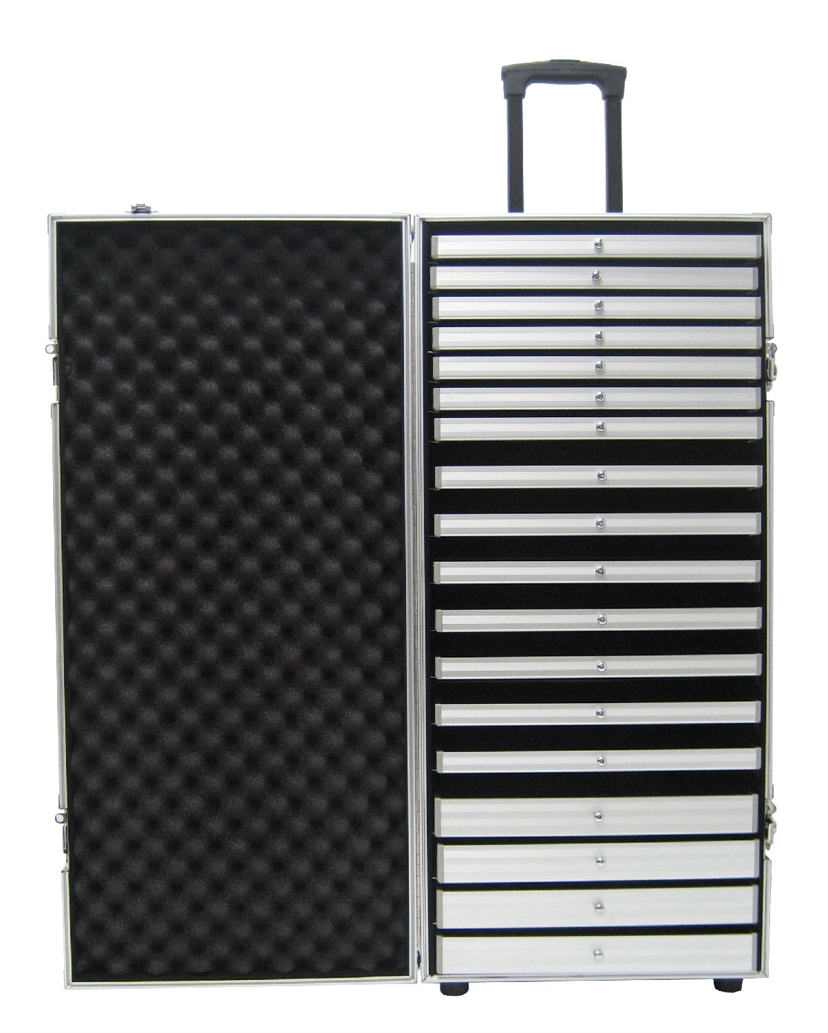 The displayed aluminum case is equipped with a built-in telescopic trolley and has 2 recessed corner back wheels and 2 front feet. It has pull out trays inside for jewelry storage and has different trays for bracelets, necklaces, pendants, earrings, rings, bangles and full sets. This aluminum case flaunts a high durability and can protect the stored jewelry from dust, scratches and damages.