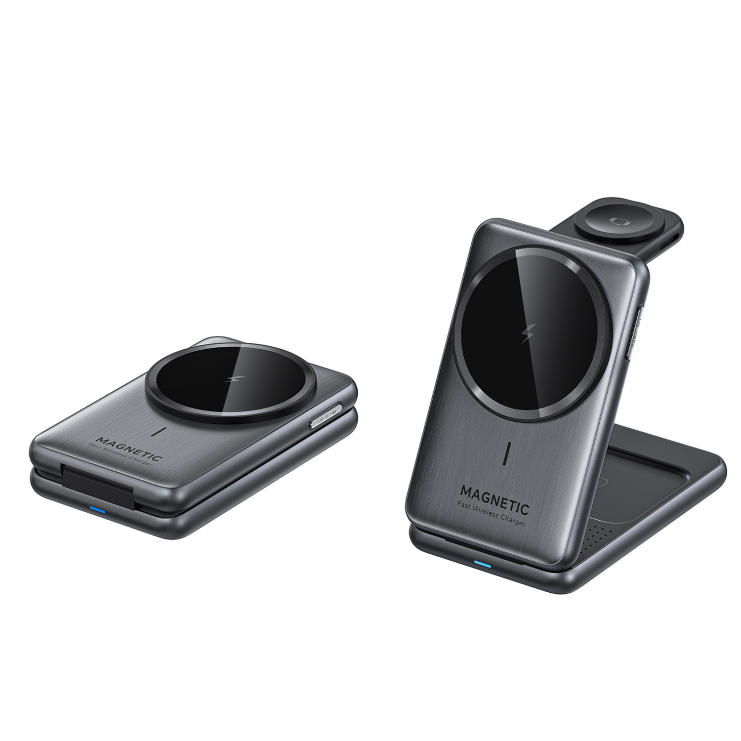 Aluminum panel 3-in-1 foldable wireless charger with pop-up iWatch charger by pushing side button