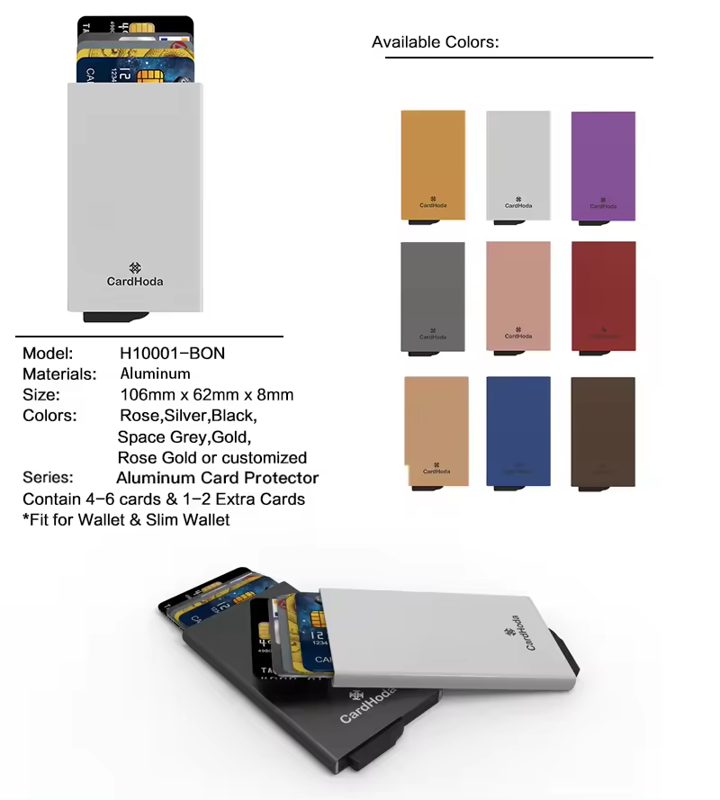 Cardhoda specialized in designing and manufacturing RFID protection products including cardprotectors, wallets, and more. Store your cards inside to prevent unauthorized RFID / NFC signal scanning and reading. Products are designed in Hong Kong and manufactured at our own factory located in Mainland China. Every piece will go through quality assurance and control before they reach to you. Our cardprotectors have been granted European Invention Patent issued by European Patent Office (EPO).Apart from adaption of synthetic leather and FSC certified packaging, we are continuing to experiment GRS recycled leather and recycled Aluminum in order to minimize waste while keeping the quality.