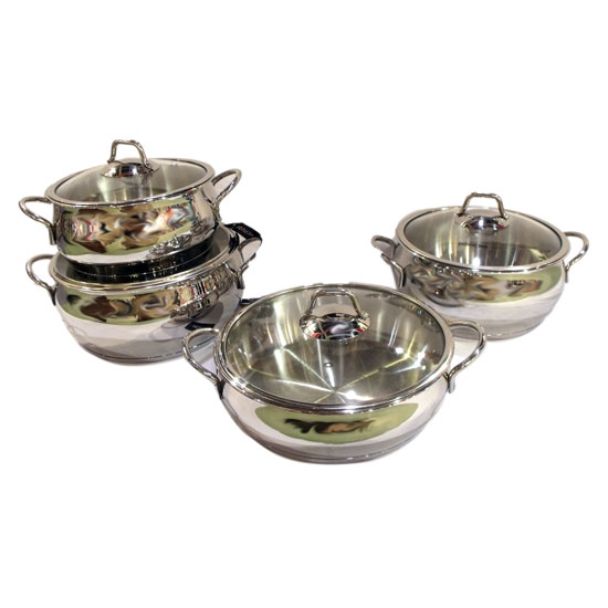 Featured here is a set of stainless aluminum pots in four different sizes. These pots are designed with transparent lids for easy viewing of the ingredients inside. These stylish and functional pots are great additions to every kitchen.