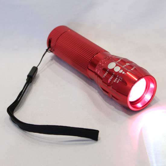 Shown here is an aluminum flashlight with a robust construction that is weatherproof. A hand strap is attached to the flashlight for easy carrying. This aluminum flashlight with a sleek and lightweight design is good for camping and hiking.