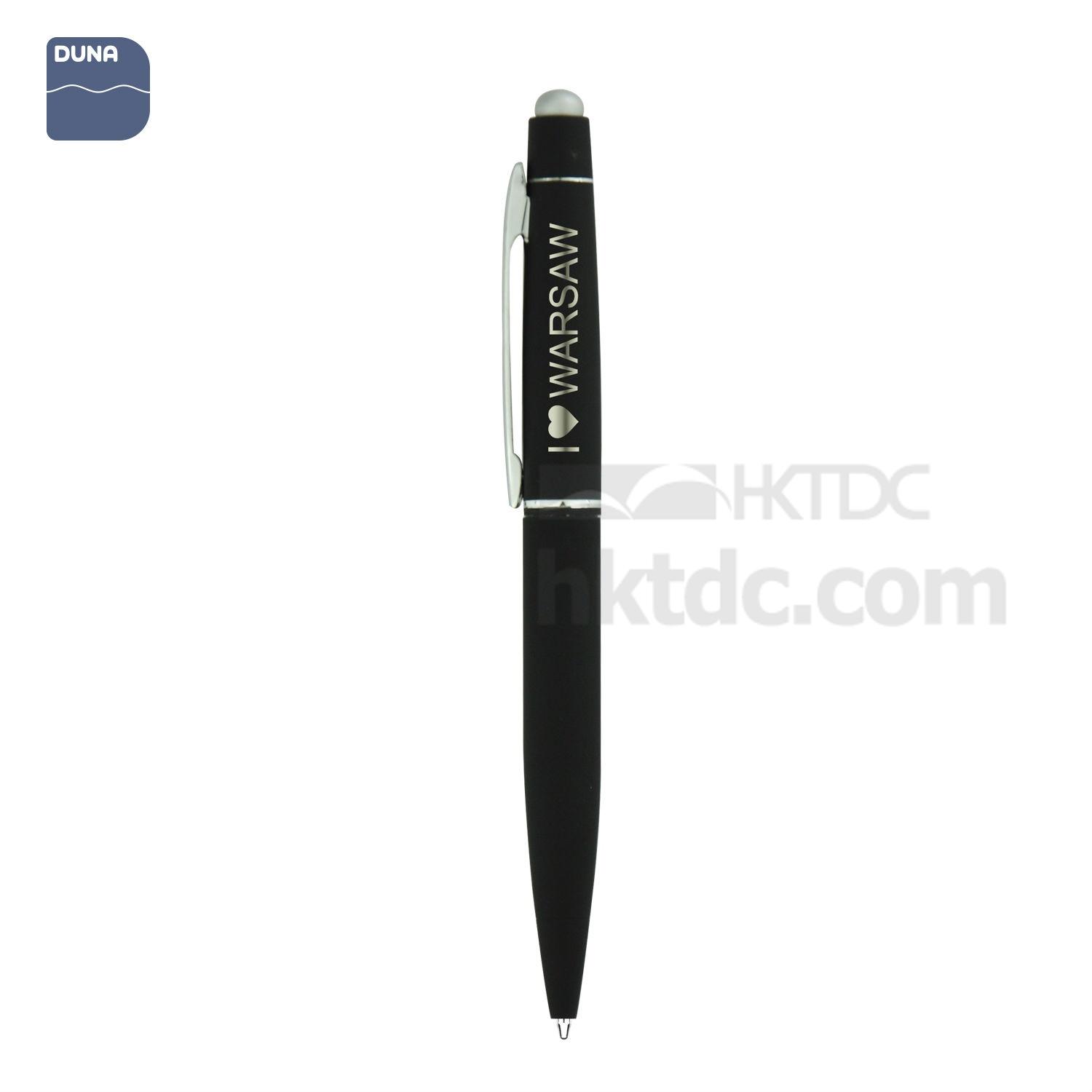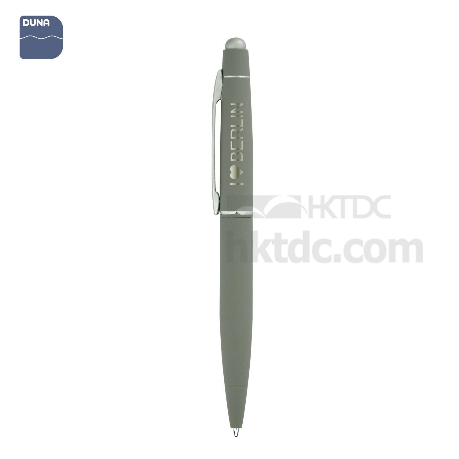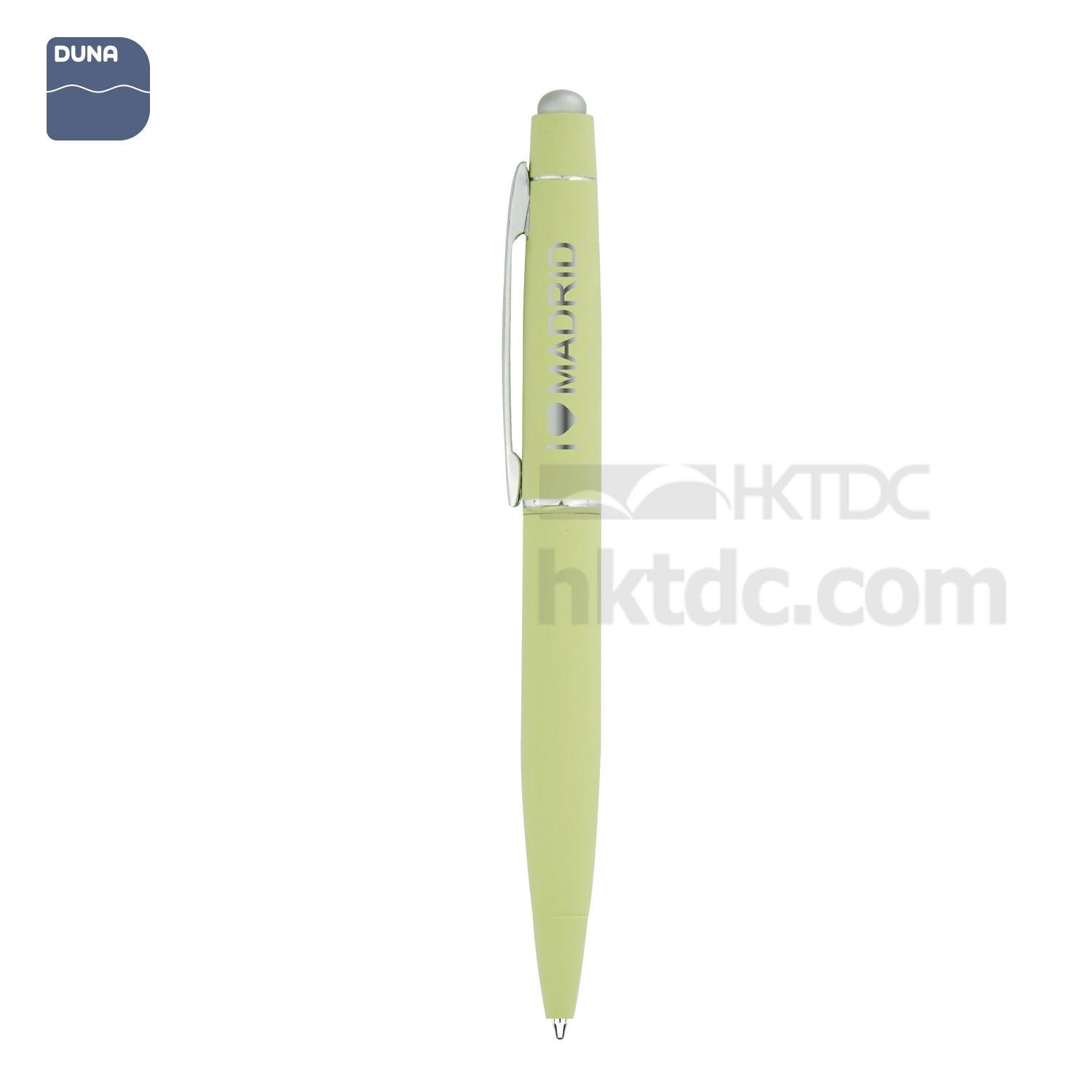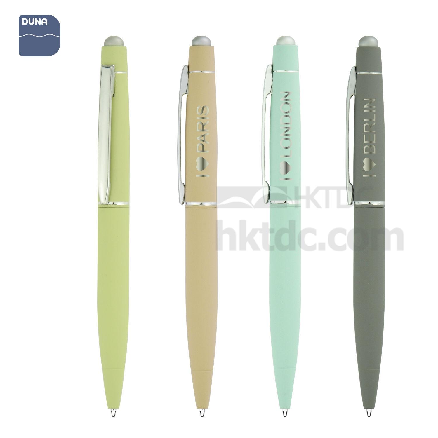 It is a metal ball pen. Barrel Aluminum & black color, cap colorful.   top with colorful touch. Barrel rubber coating and can laser colorful Logo.
