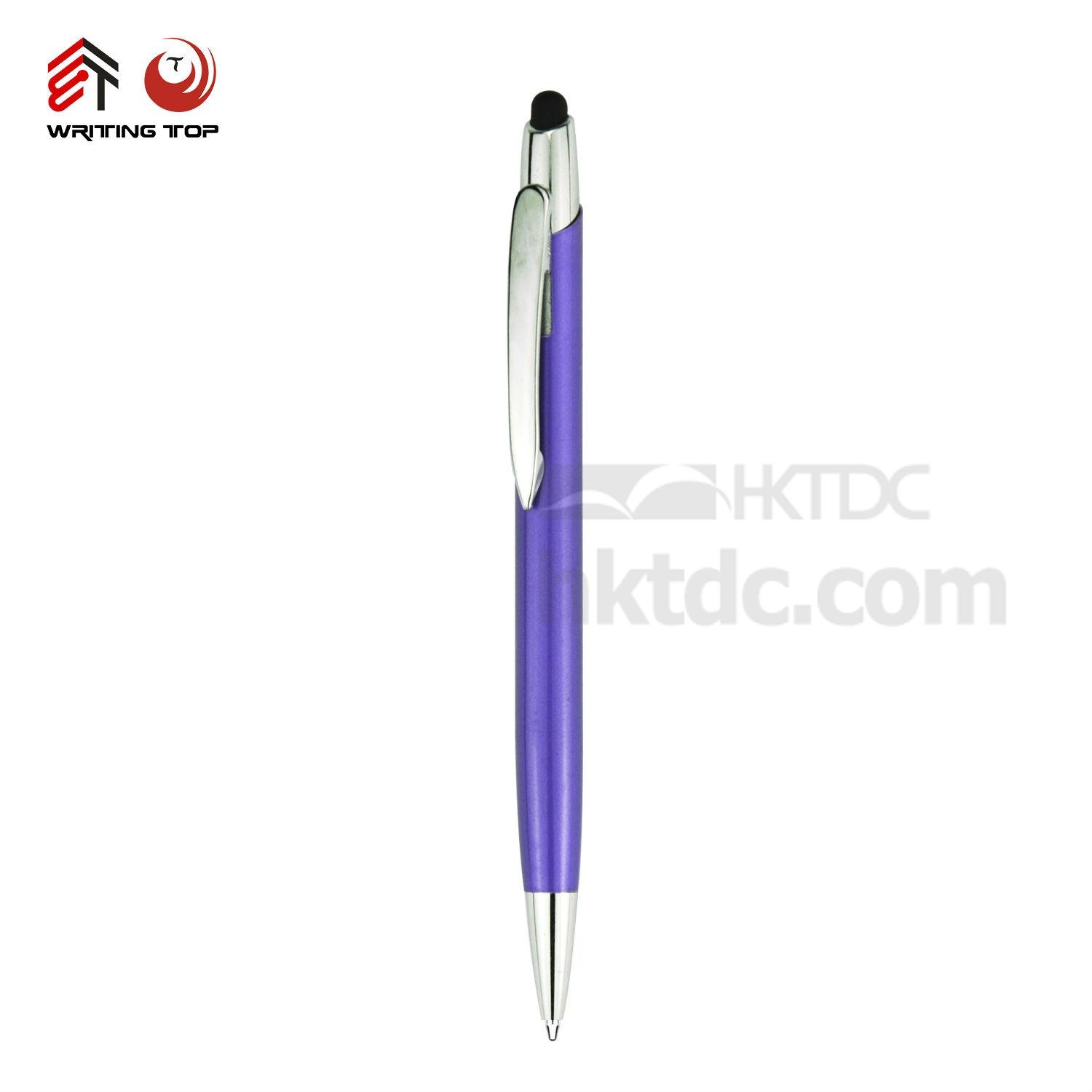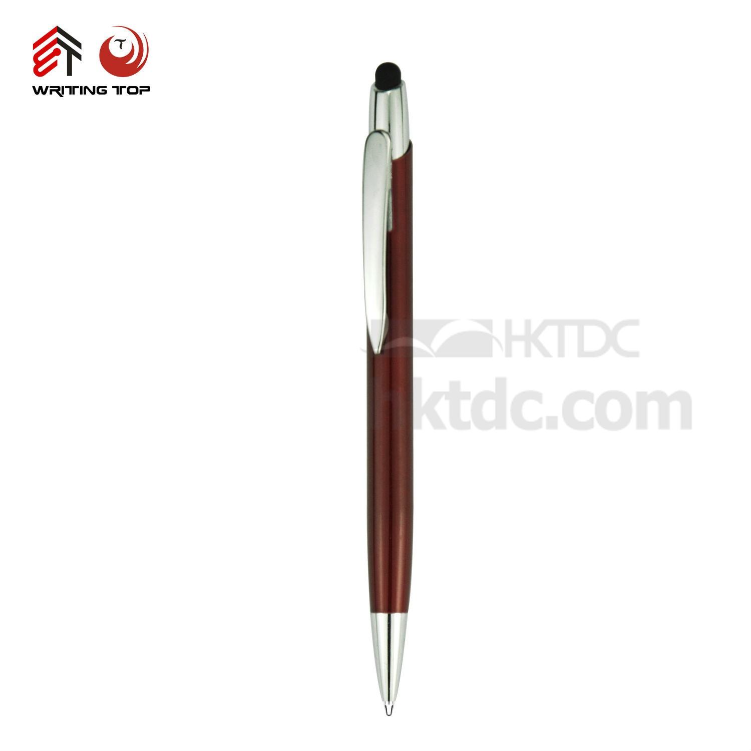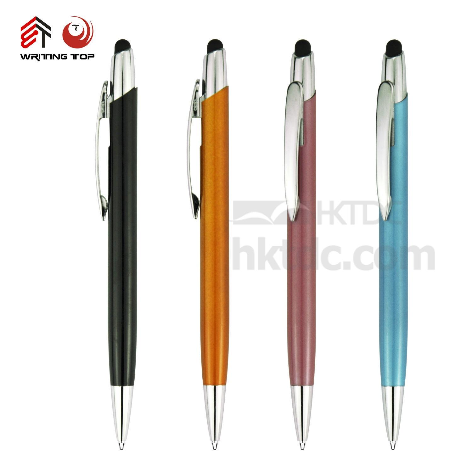It is a metal ball pen. Barrel Aluminum , cap sliver.  top with touch. Barrel can laser Logo.