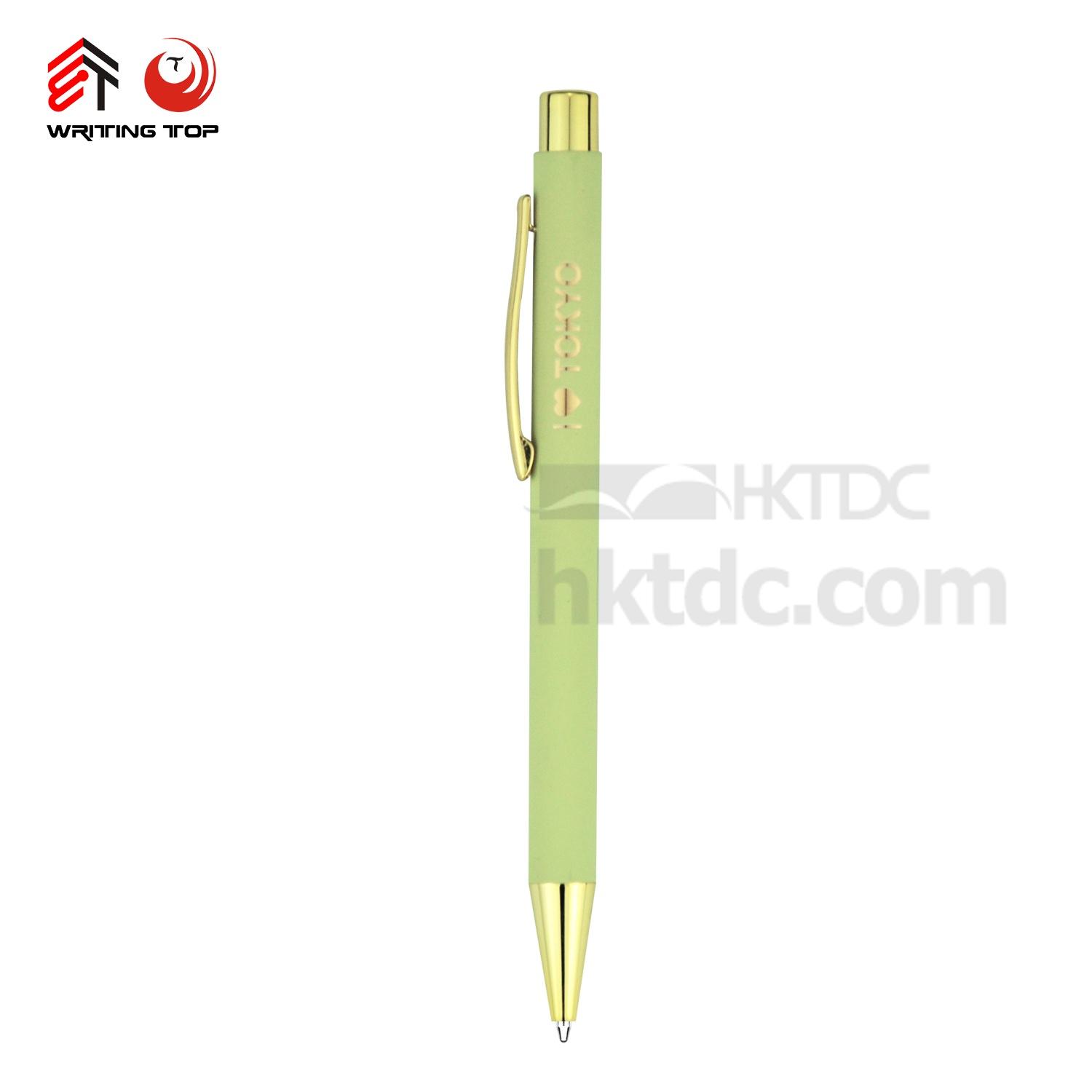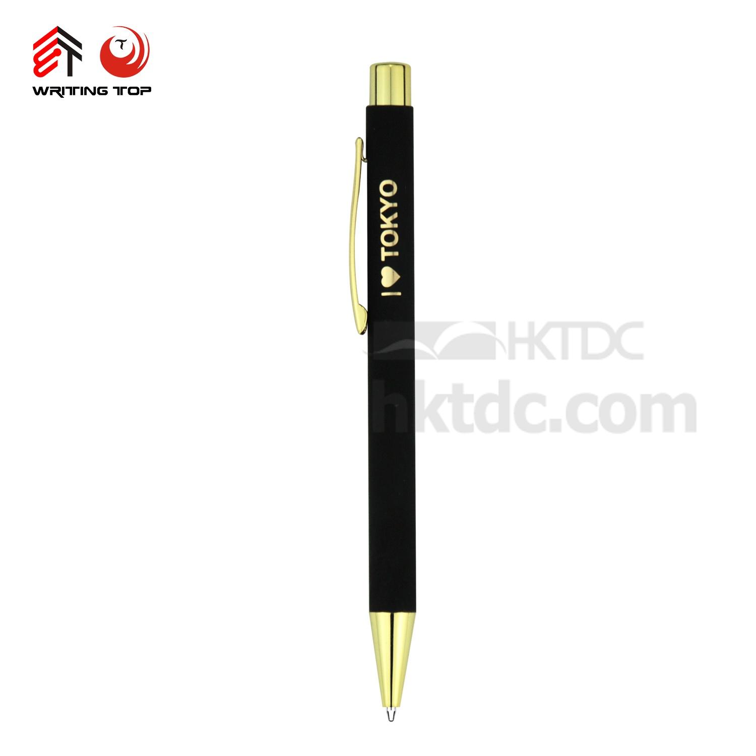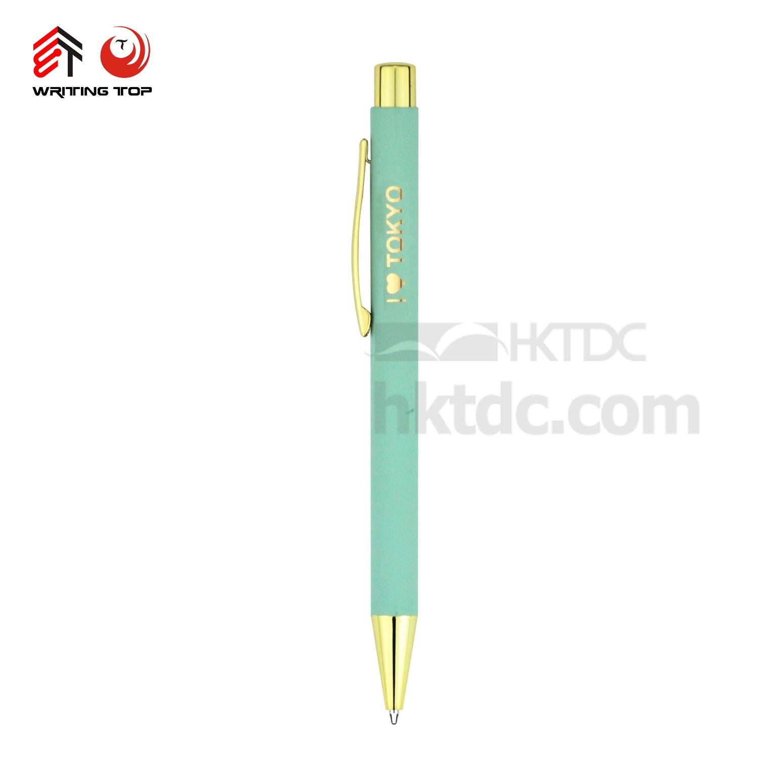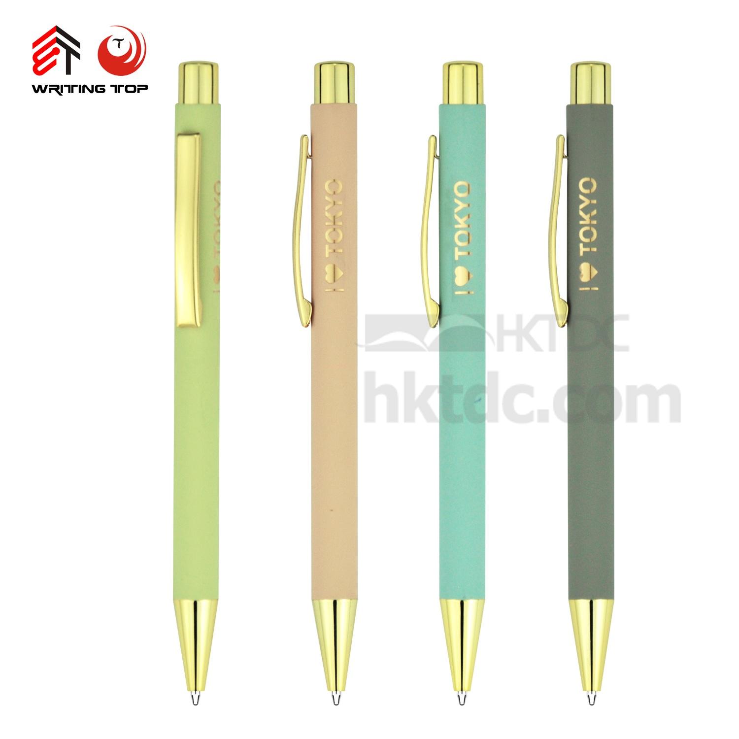 It is a metal ball pen. Barrel Aluminum & colorful.  Other accessories plastic material with gold color. Barrel rubber coating can laser & print Logo.