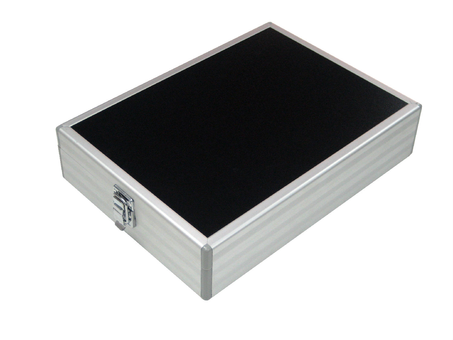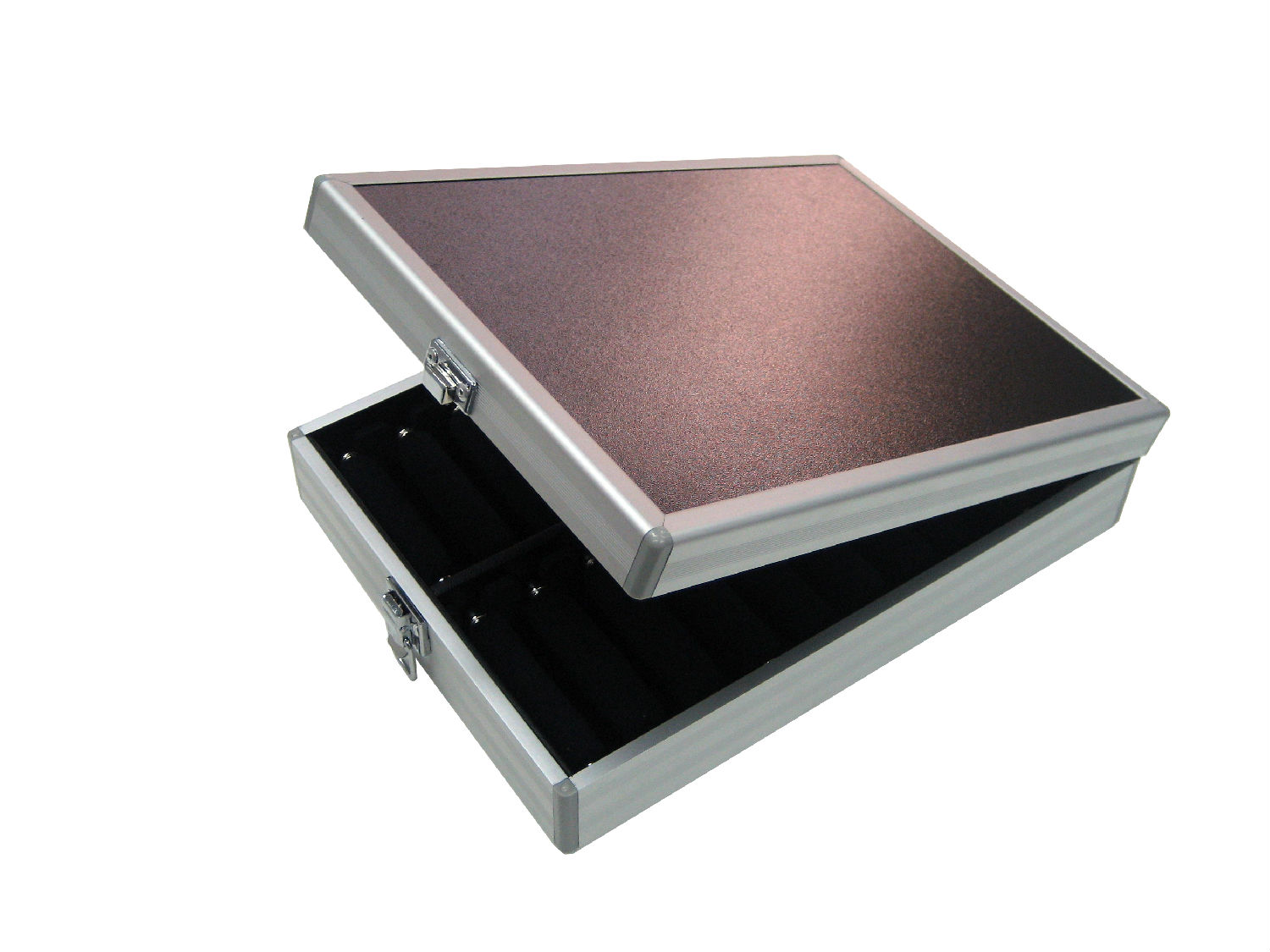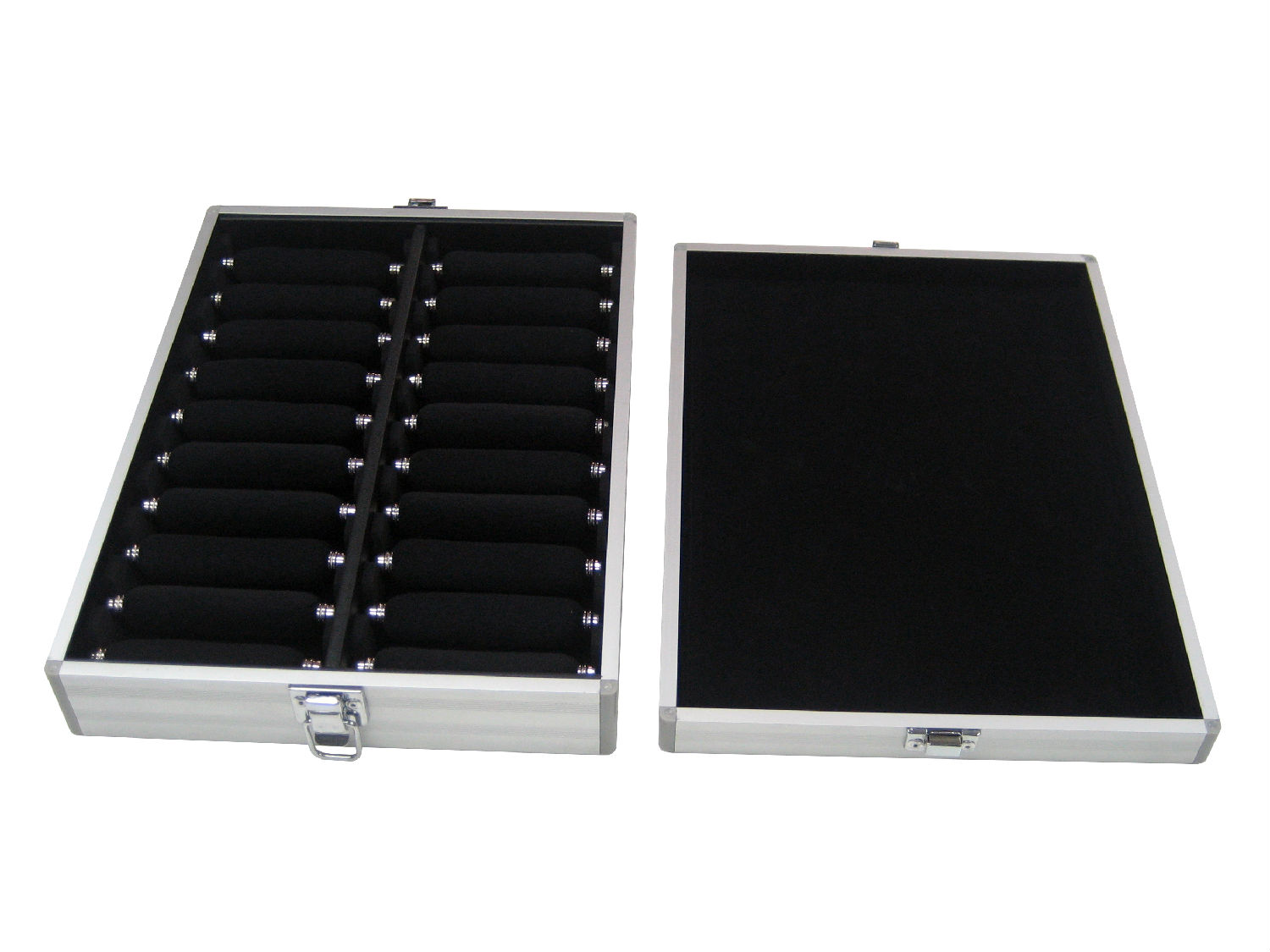 This ring tray is made of aluminum and has twin columns with 20 ring bars for holding rings. It has a lid for covering and has square clasp locks at opposite short ends. The ring tray has an aluminum frame adorned with stripes patterns and has reinforced corners for added durability.