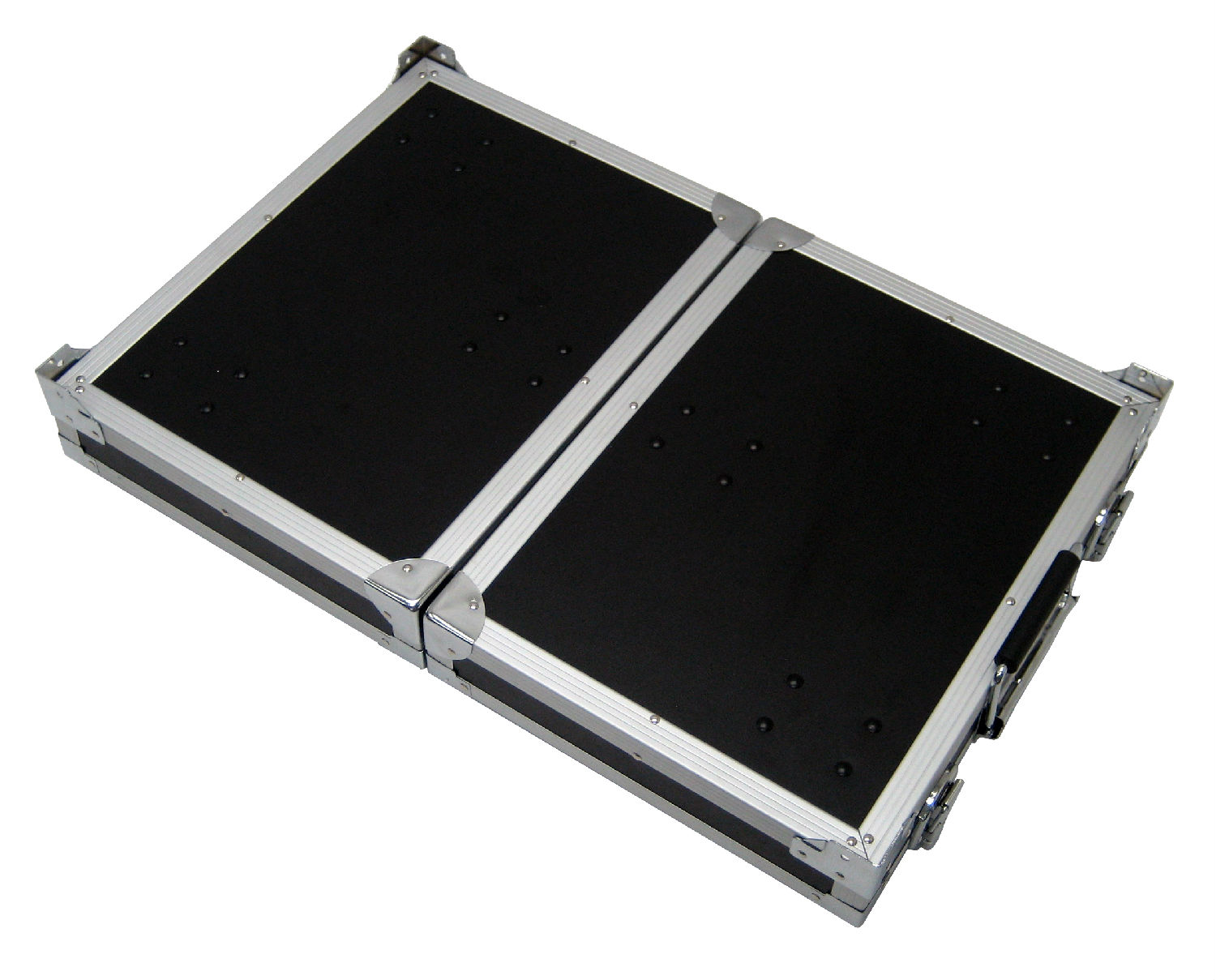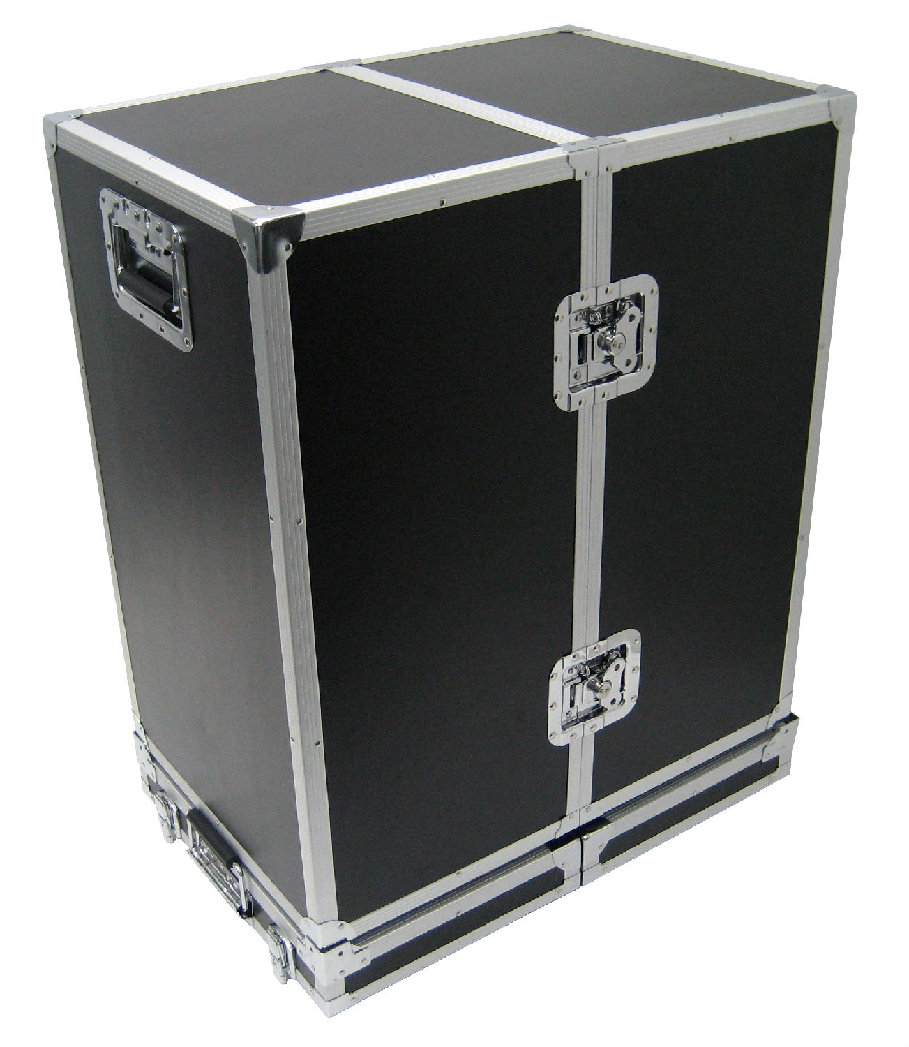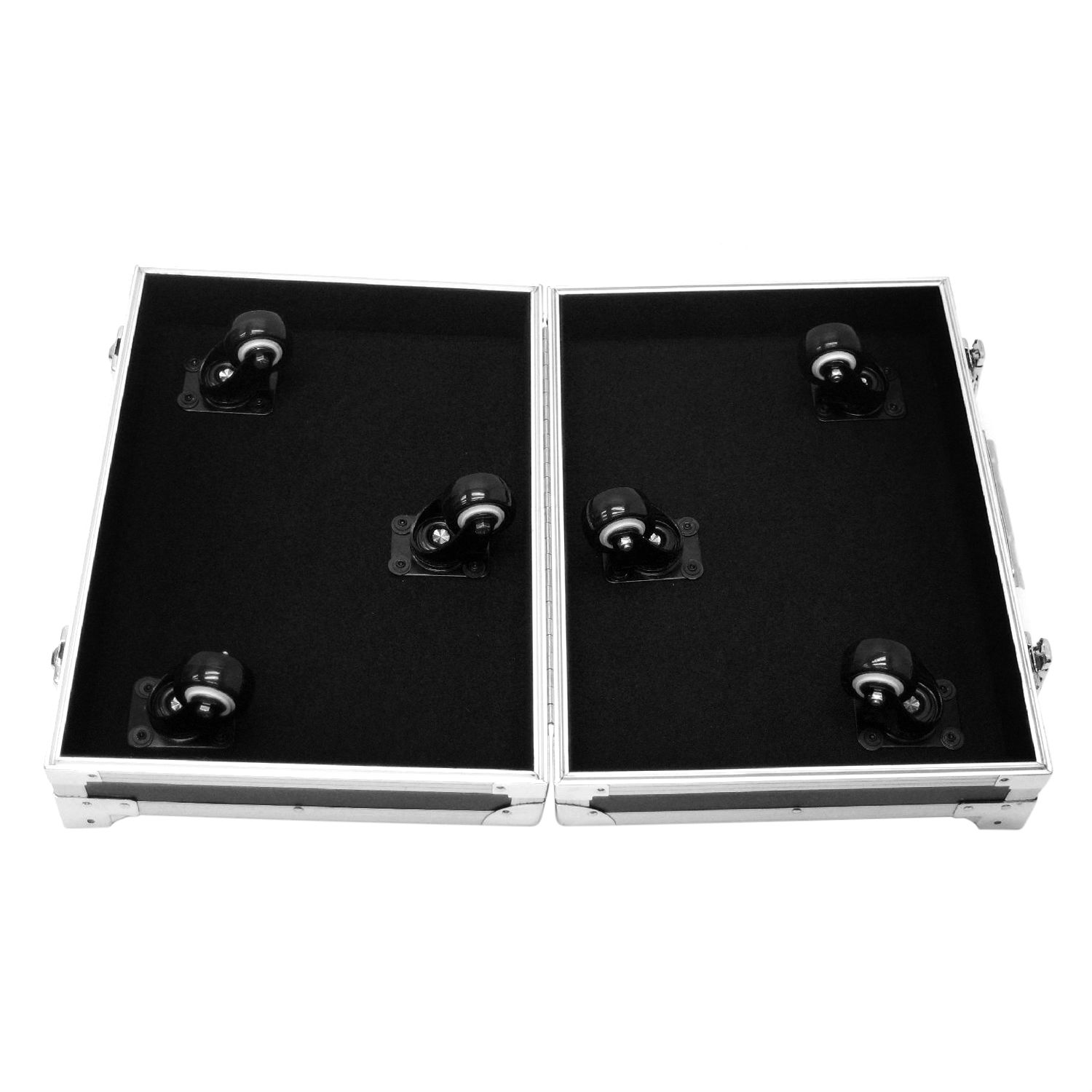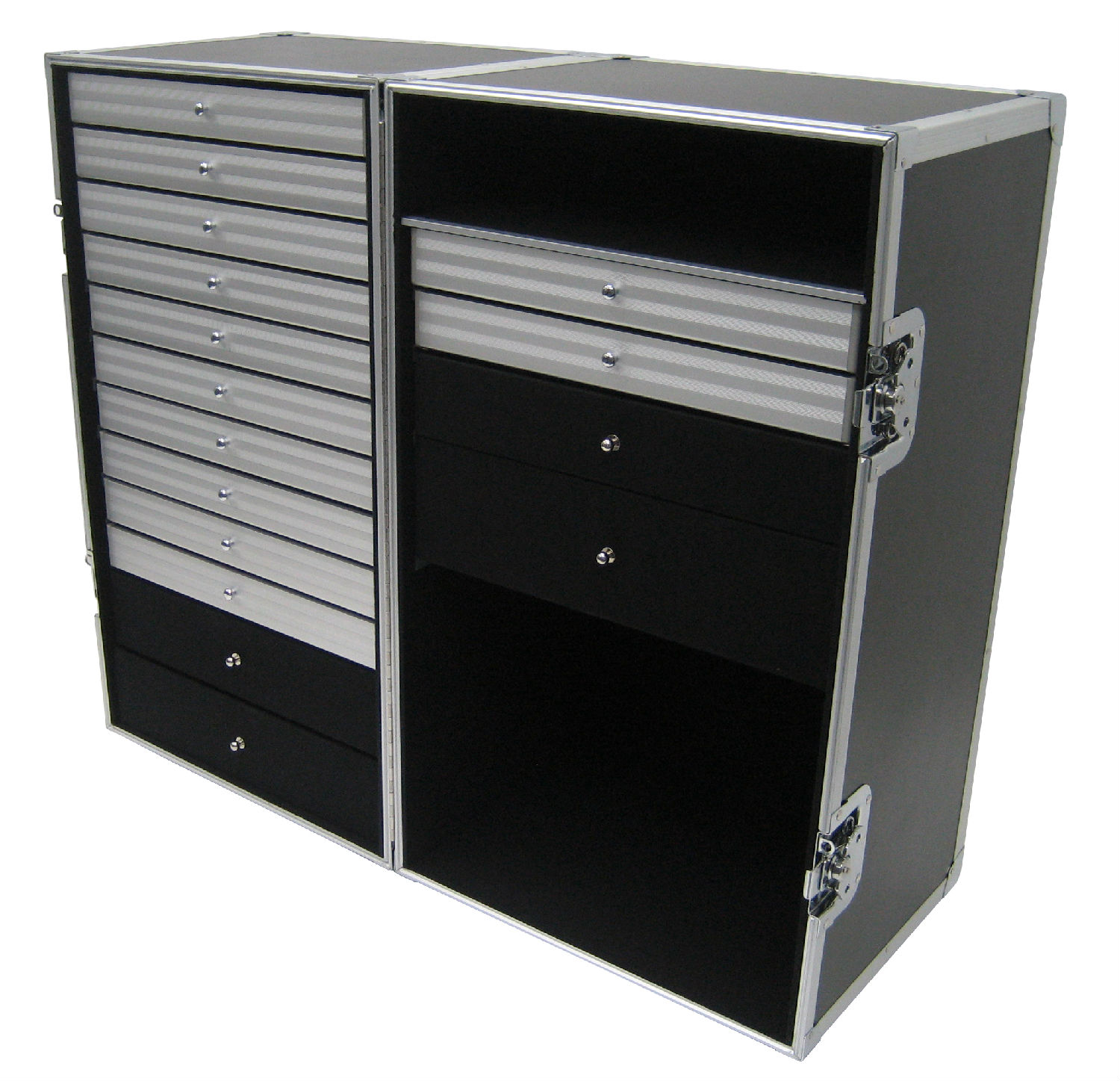 Highlighted here is an aluminum roller case with black HPL surface finishing and black brushed tricot lining. On the left side of the case there are 4 pull out drawers with empty compartments on the top and bottom while on the right side there are 12 pull out drawers for storage. This aluminum roller case flaunts a high durability and provides unparalleled protection to items inside.