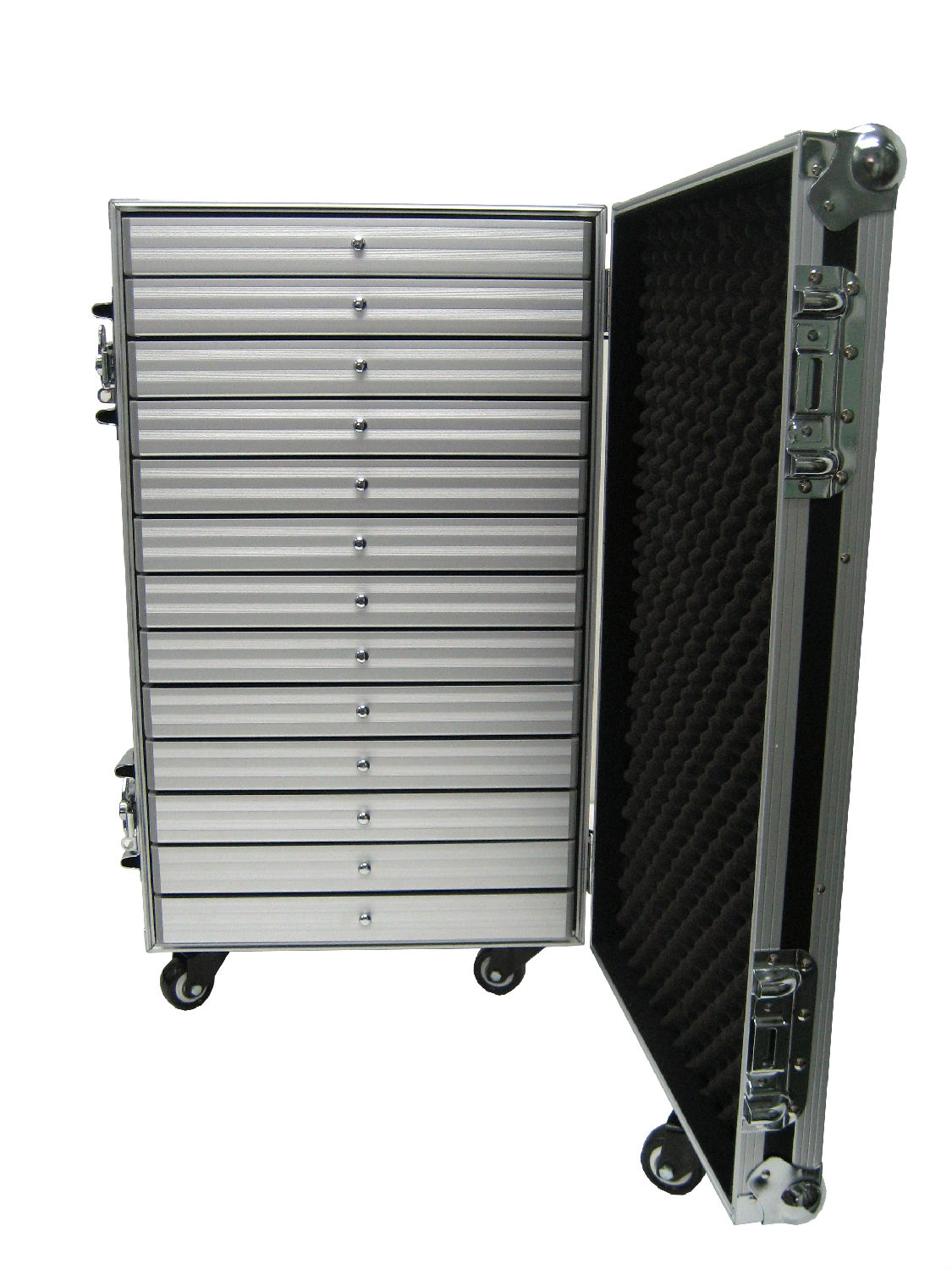 Securely transport jewelry, watches and other important items with this aluminum roller chest. It has black brushed tricot lining inside and has 13 aluminum pull out trays for storage. This aluminum roller chest has 2 spring loaded steel recess handles and has 5 castors with 2 brakes for easy moving.