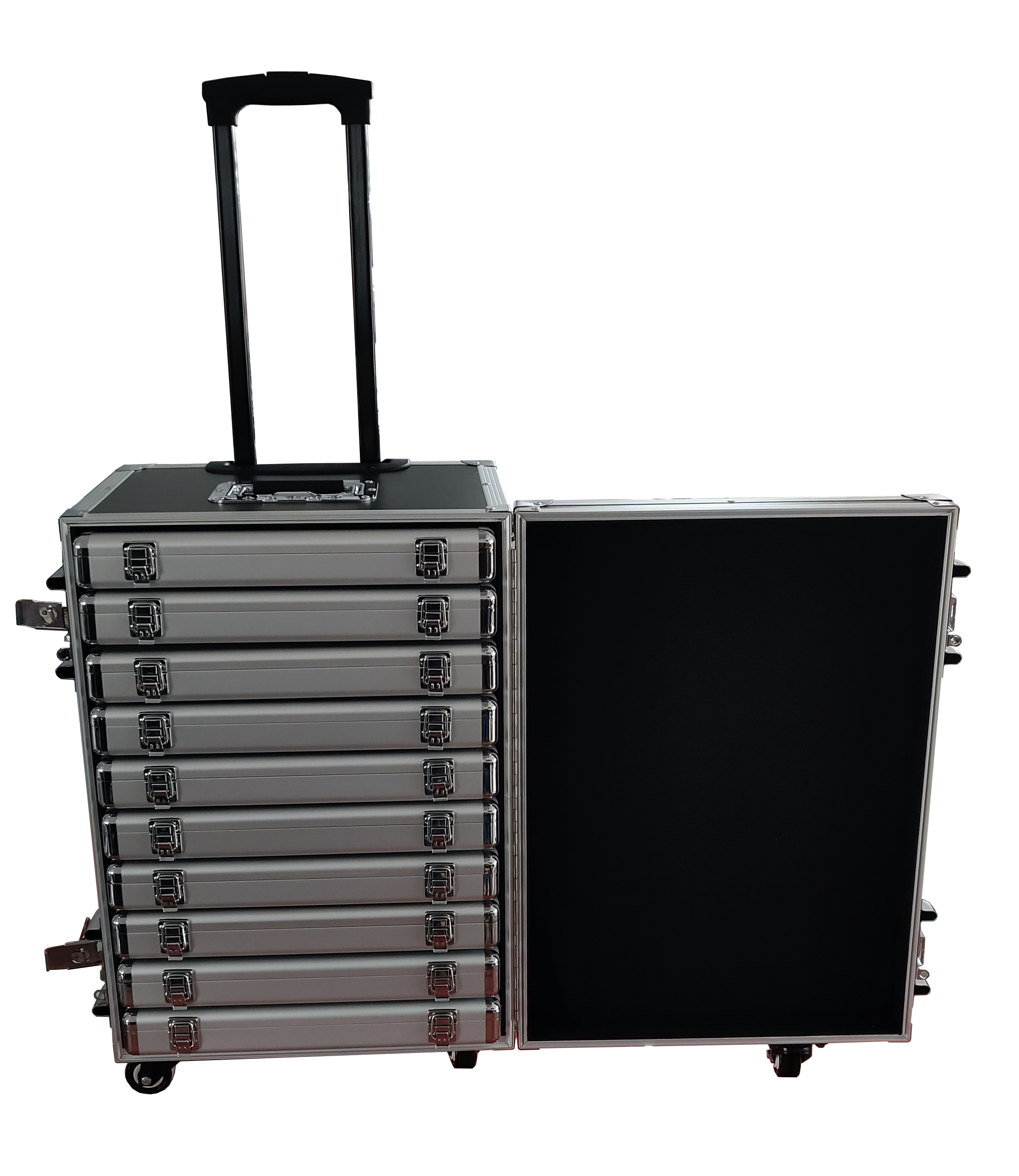 Provide reliable storage for your belongings with this aluminum roller chest. It comes in a spacious rectangular design and has 10 aluminum boxes inside for storage. This aluminum roller chest has a built-in telescopic trolley with 5 castors and is effortless to pull around.