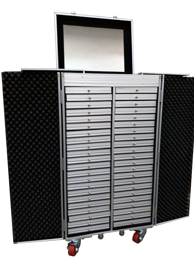 This roller chest has an aluminum profile with plywood construction and has a laminated black PU exterior. It has 3 compartments at the upper deck and has 44 aluminum pull-out trays in twin columns for storage. Equipped with 4 castors underneath, the roller chest can smooth move on any flat surfaces.