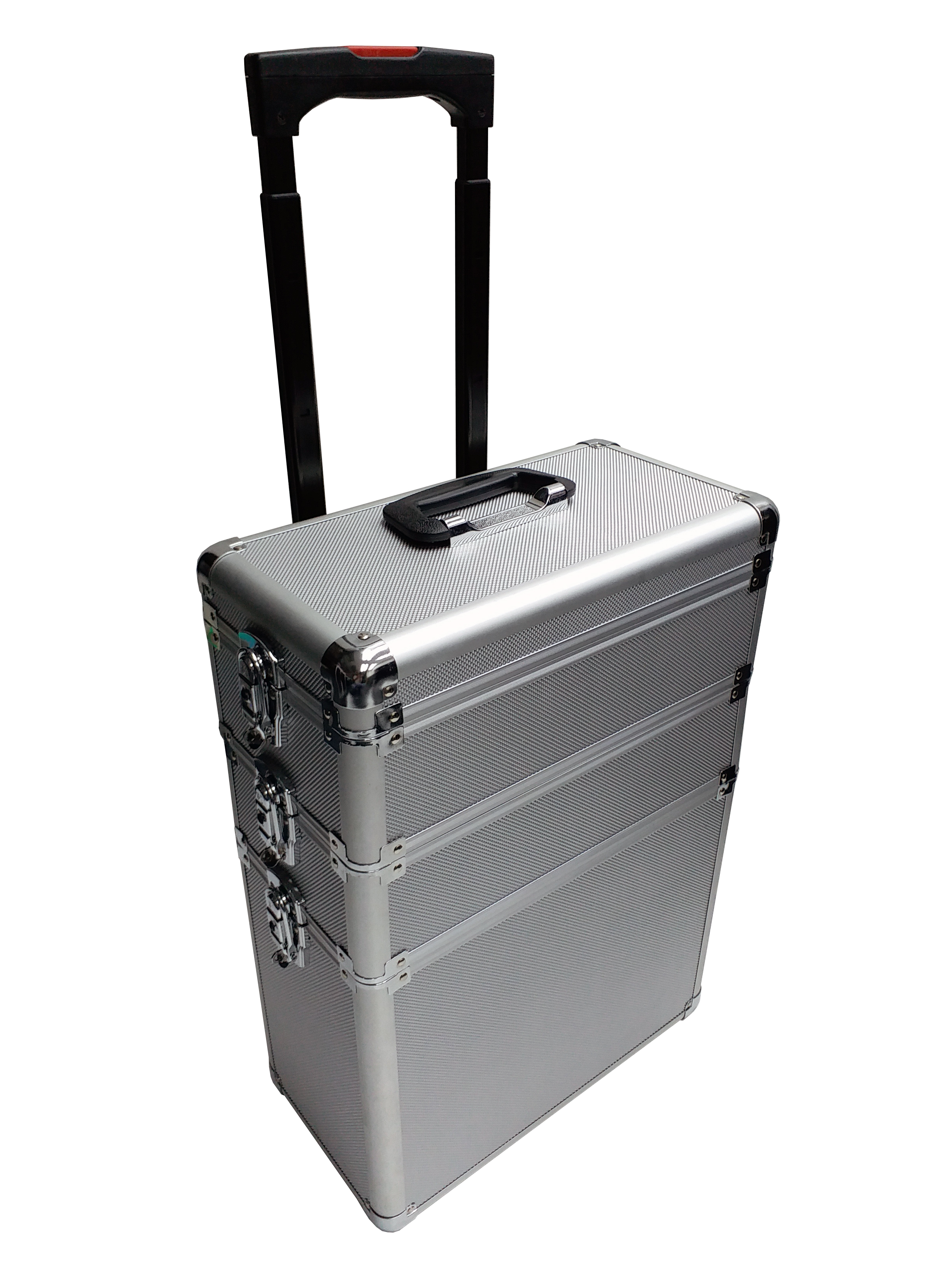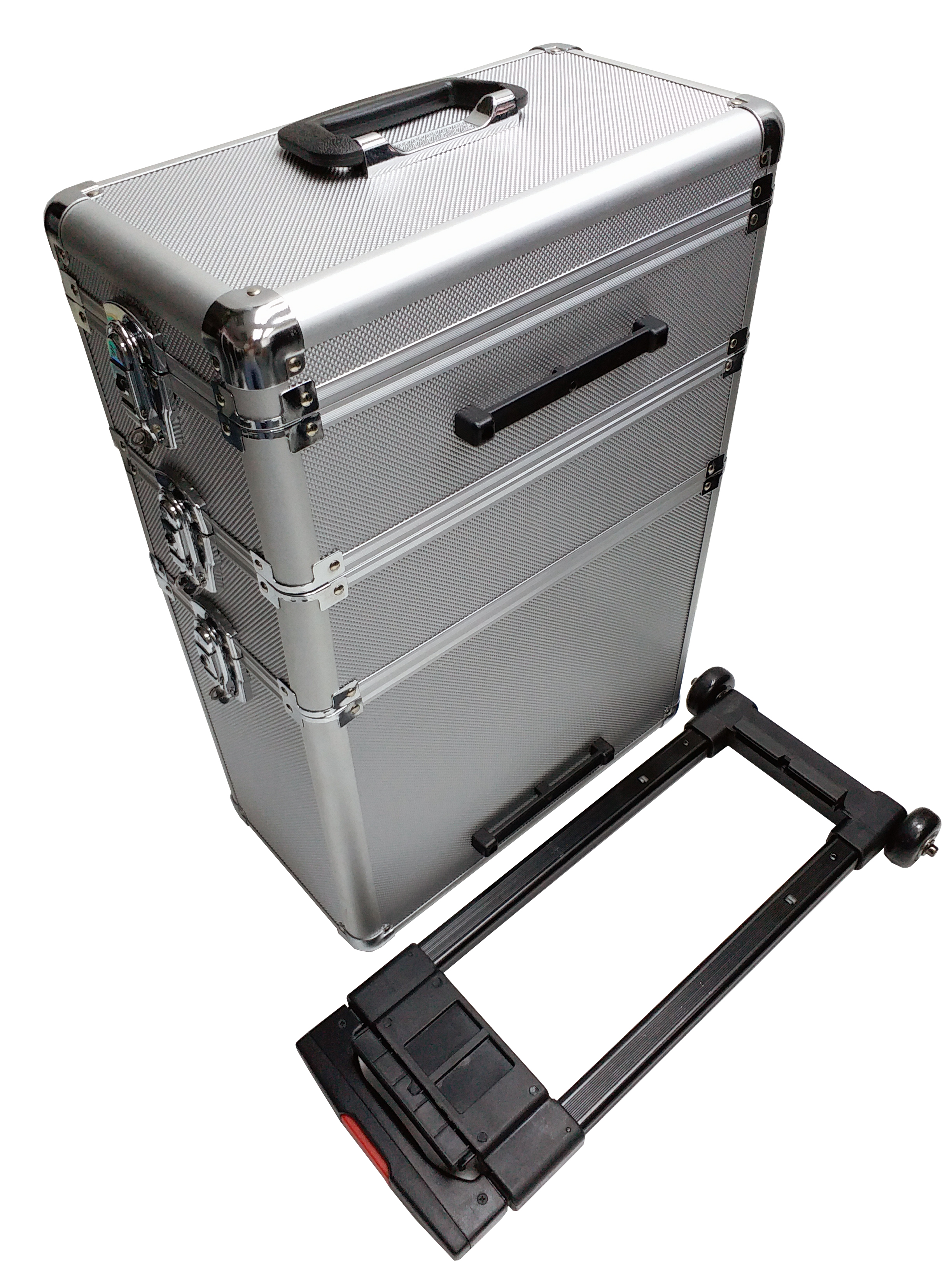 The displayed aluminum trolley case comes in a 3-section design and has a loose lid. It has 14 pillows with lined wooden cross dividers in the upper and middle sections and has 3 compartments with an aluminum jewelry box. The trolley of this case is detachable and has a telescopic handle for comfortable pulling.