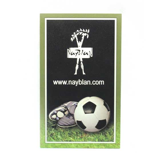 This sport plate features the brand's icon, website and graphics related to soccer in a black background with a green frame. With good graphic design, the words and the images are nicely balanced. Using images of a football and a pair of sneakers arranged on grass, the theme of soccer is emphasized.