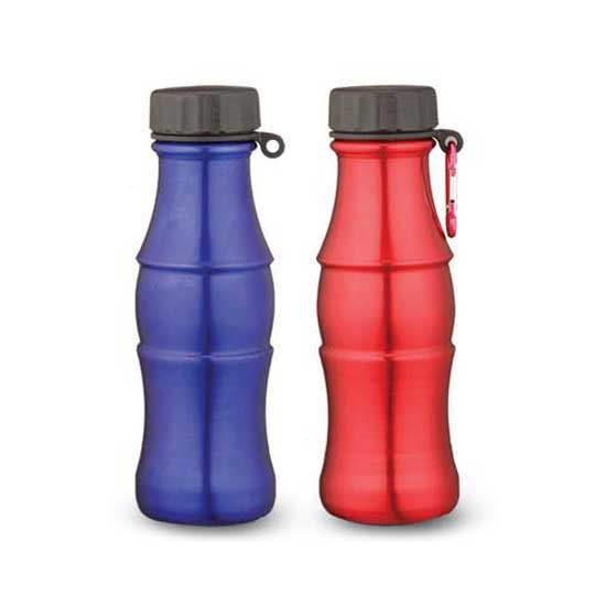 Presented is an aluminum sports bottle with a color-coated body that is visually appealing. The cap comes with a metal carabiner that is designed to attach to a backpack. This sports bottle is a sleek and lightweight beverage flask for campers and hikers.