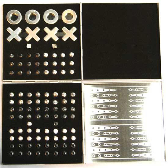 This aluminum travel game includes a tic-tac-toe game, a chess and a backgammon game, all packed in a square case. The game features black playing boards for a classy style. Have hours of fun with this exquisite travel game.