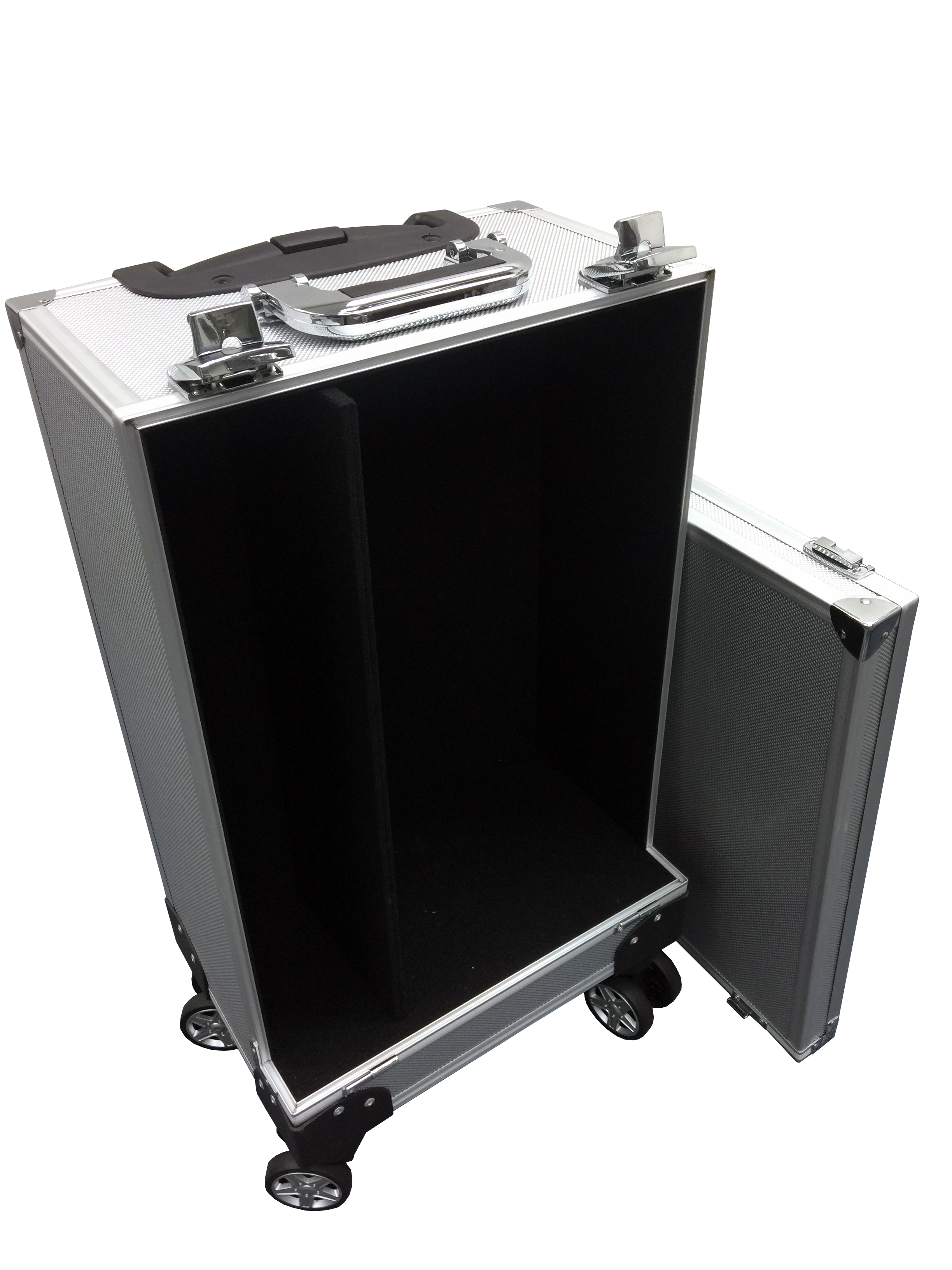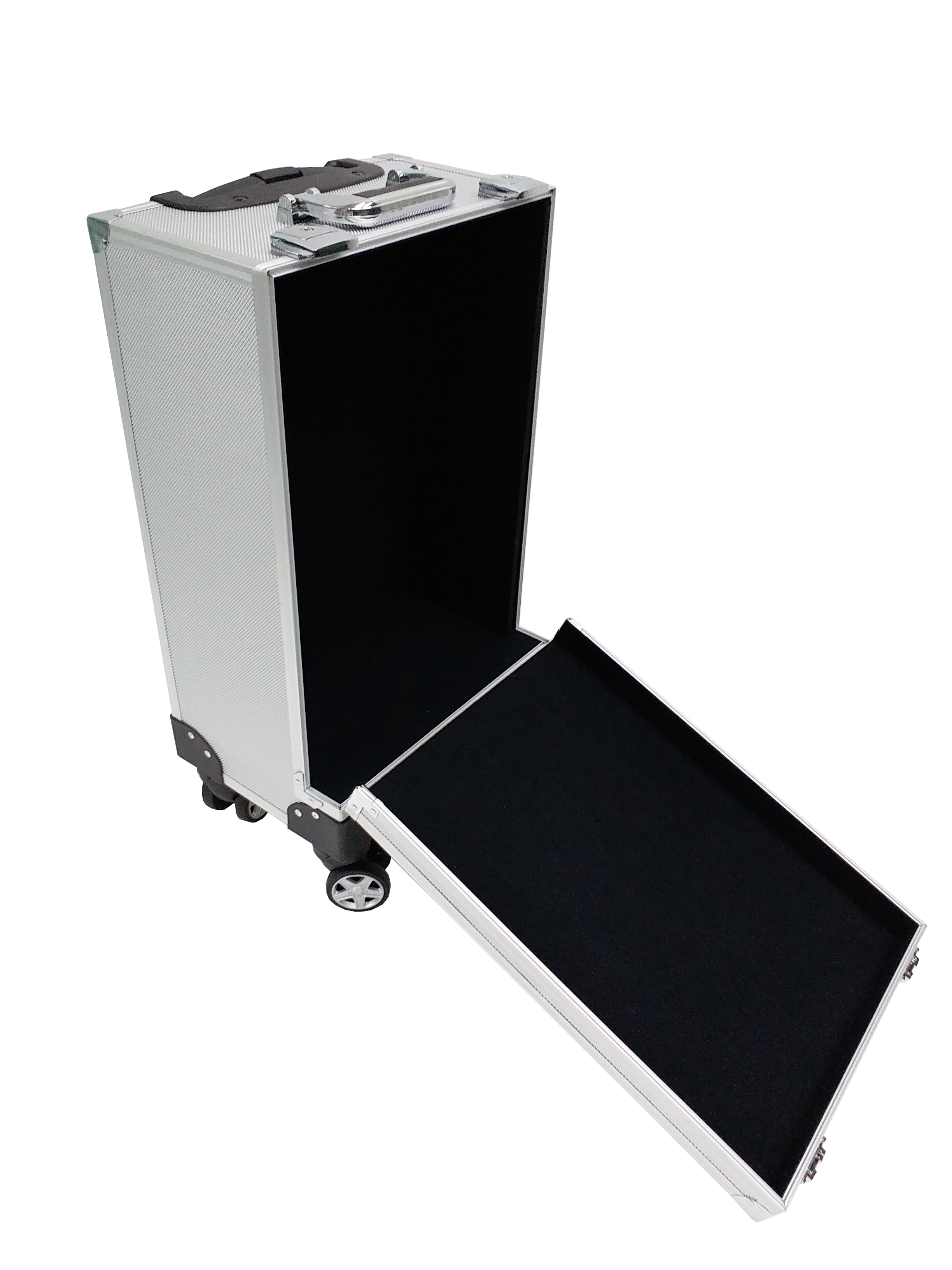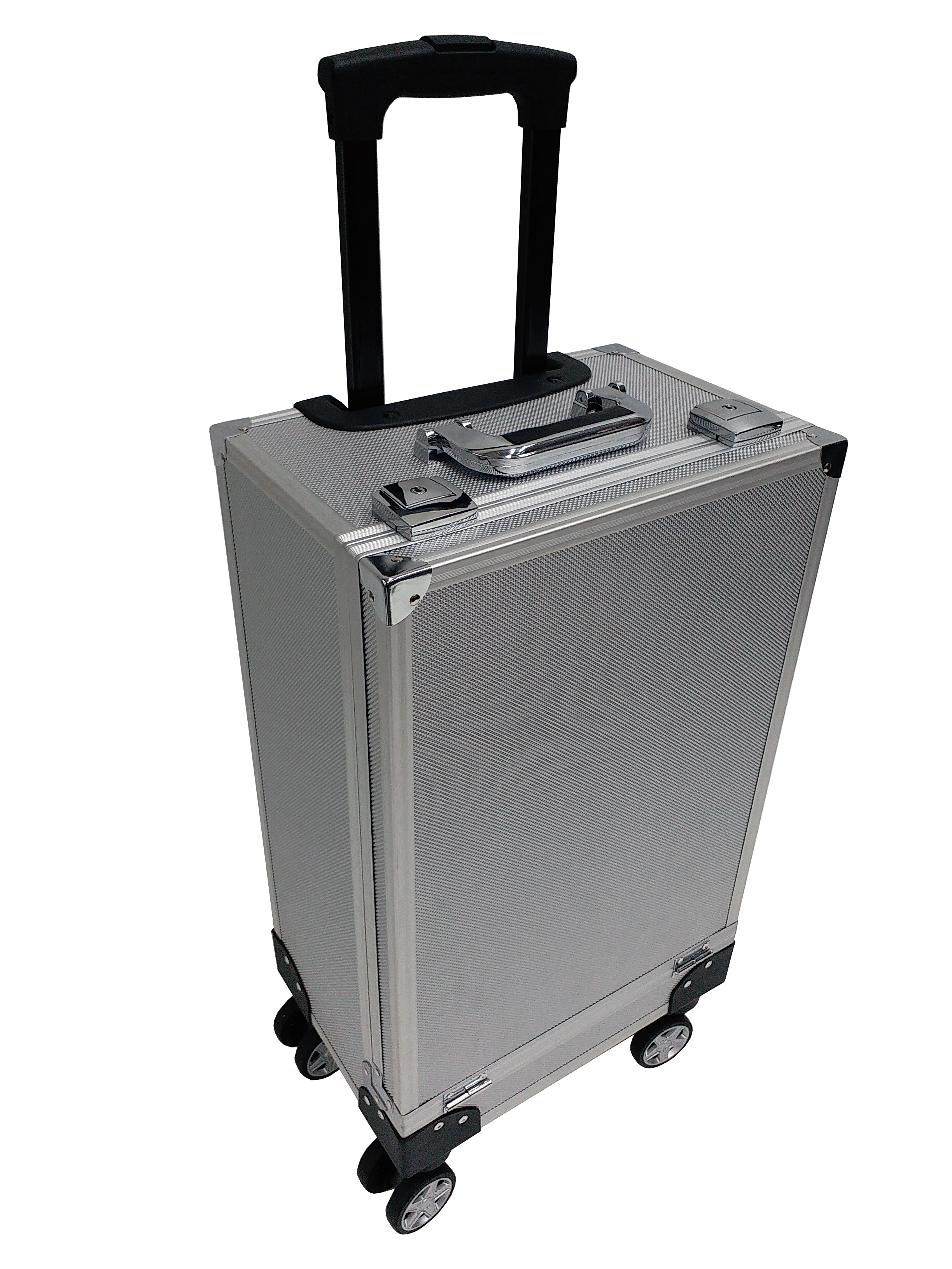 The displayed aluminum trolley comes in a rectangular design and has diamond-patterned surface finish. It has a telescopic rubber-padded handle at the back and has 4 detachable corner castors. This aluminum trolley provide reliable protection to the contents inside and is excellent for travelling use.