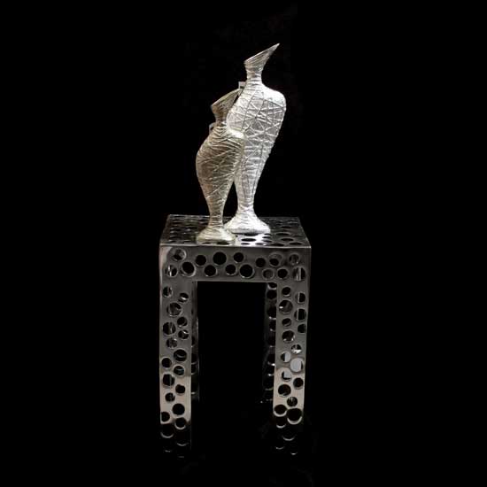 This modern aluminum vase features an irregular shape with flowing lines. The embossed surface texture creates a unique and magnificent finish to the vase. The vase will add a touch of elegance to any home decor