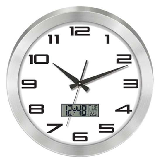 The wall clock features a round metal case with a polished finish. The digital calendar and thermometer offer addition functionality for users. The clean and contemporary design makes this wall clock a great fit for modern household settings.