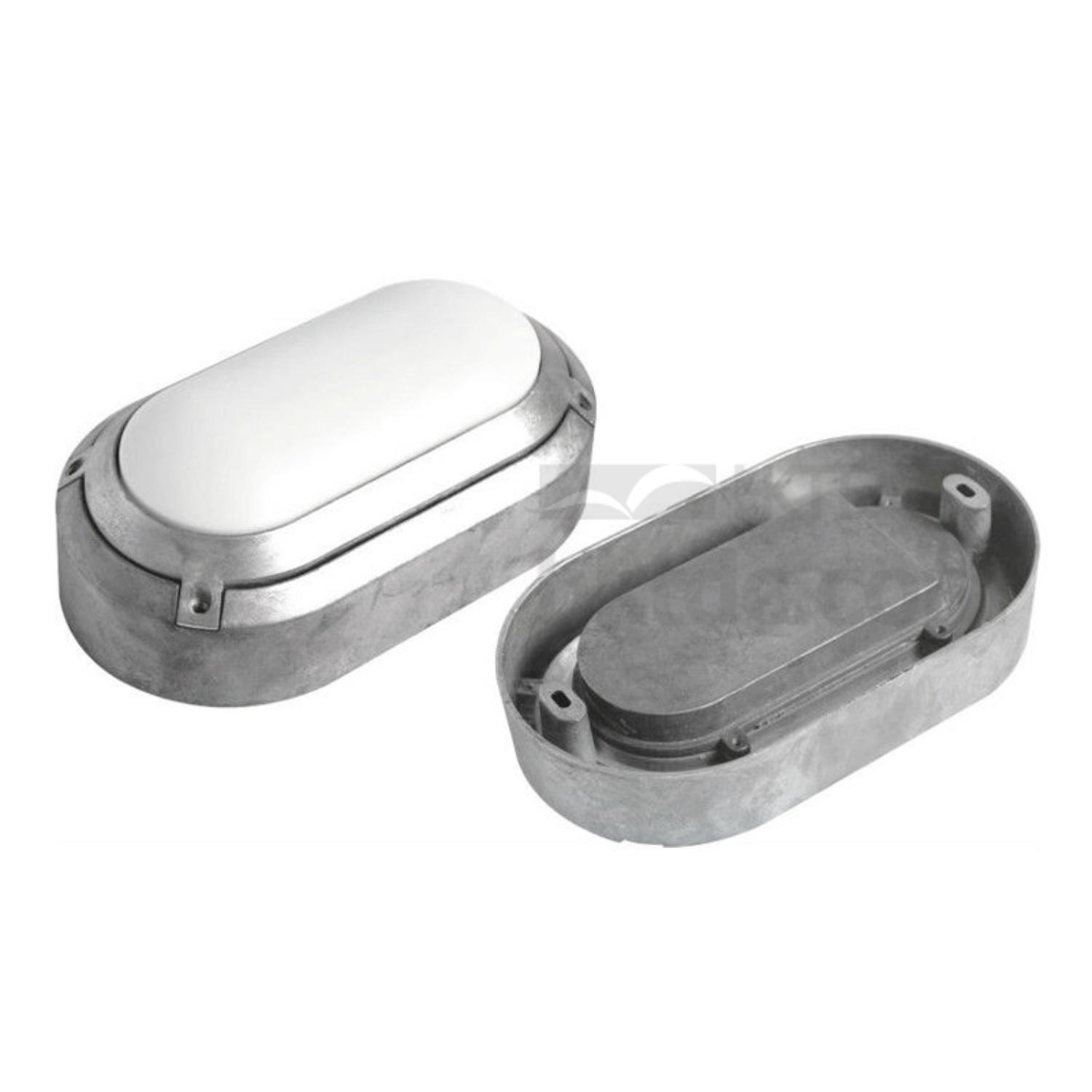Demonstrated is a die-casting aluminum light housing. It features a dome-shaped PC cover and a wall-mounted base. Fashioned with outstanding dust-proof and water-resistant performance, this dependable housing shields the components with longer-lasting durability.