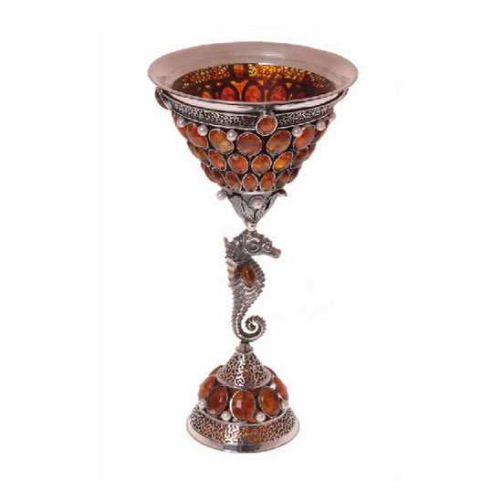 Showcased is a beautifully crafted glass made out of precious amber. This piece is finished with great attention to details. Its handle is represented by a lifelike sea horse embellishment.