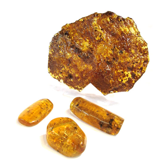 Showcased here is a rough amber rock designed for display purposes. The beautiful, distinct color and patterns of the stone delight many. Polished amber stones of various sizes and shapes are also available.