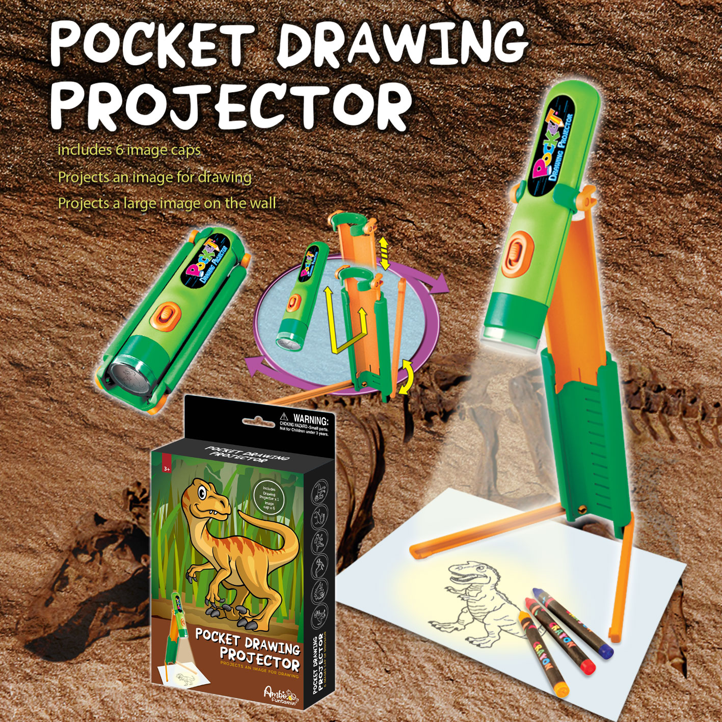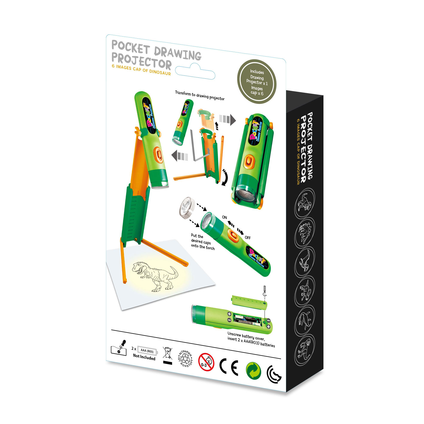 • Includes 6 dinosaur image caps for projection;