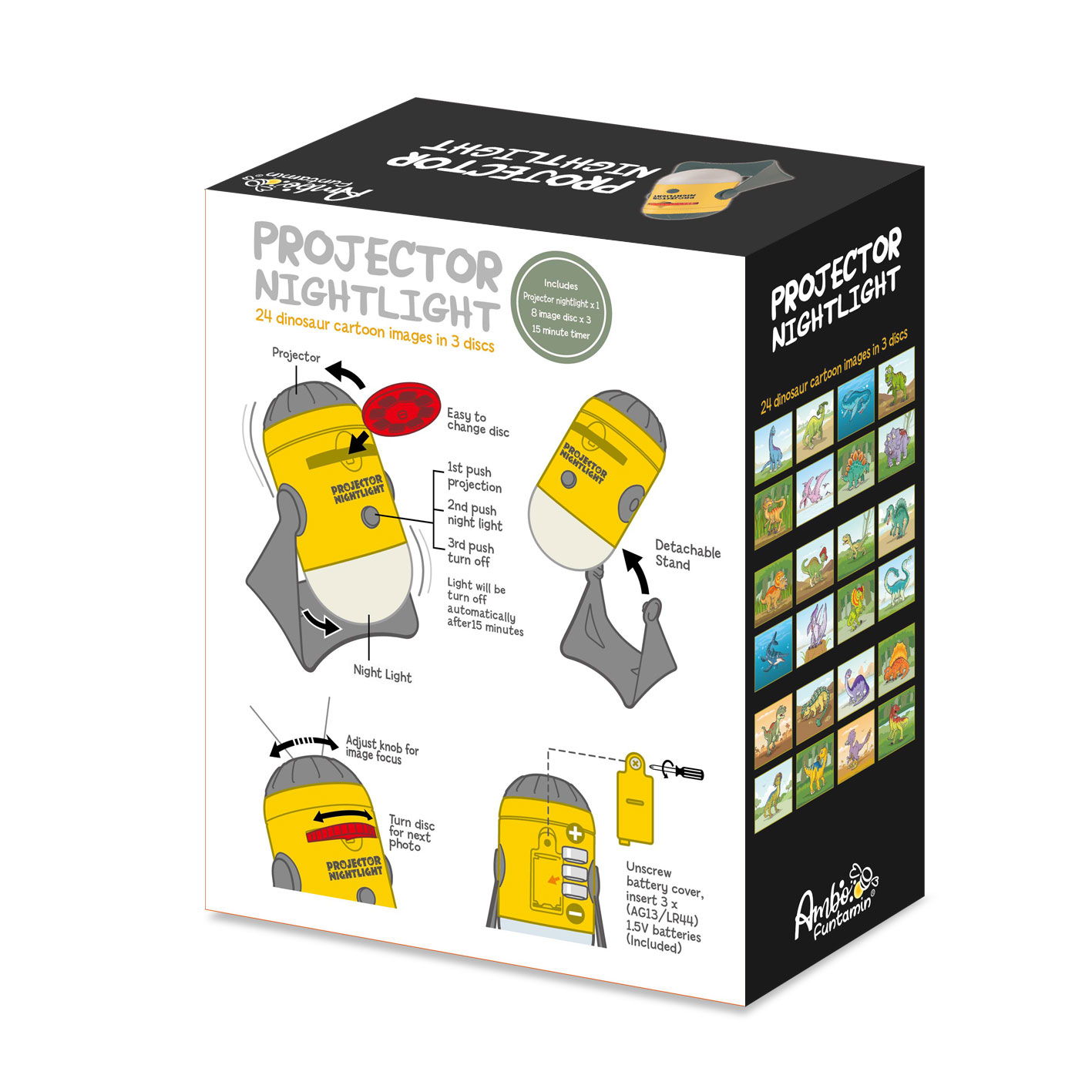 • Projects 24 colored cartoon dinosaur images from 3 discs;