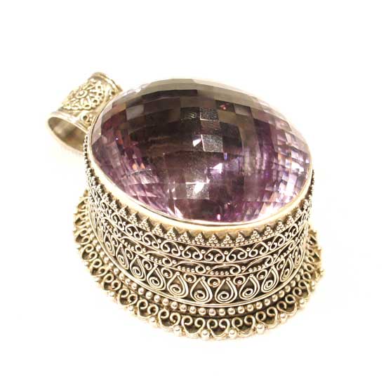 This gorgeous amethyst pendant features an oval shaped gemstone surrounded by elaborate floral detail. The faceted stone is classic and elegant. This antique style pendant lends a vintage touch to your everyday outfit.