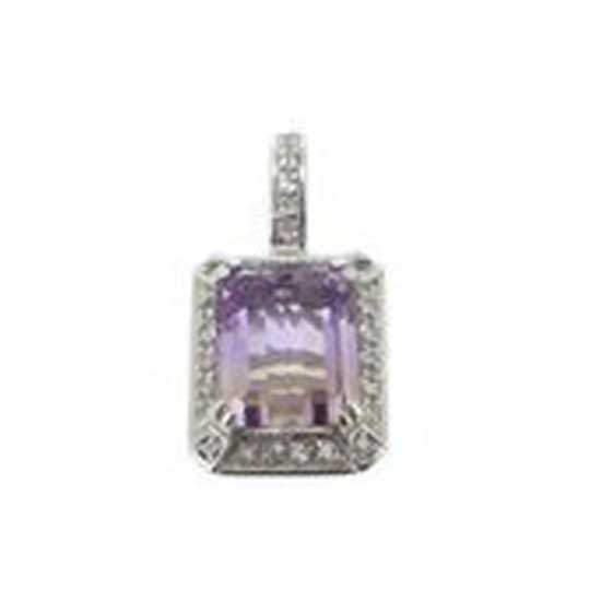 Displayed is an amethyst pendant that comes in a square shape. The light purple amethyst, professionally cut and polished, is clear and reflects light well. The gem is accented with diamonds for a fashionable look.
