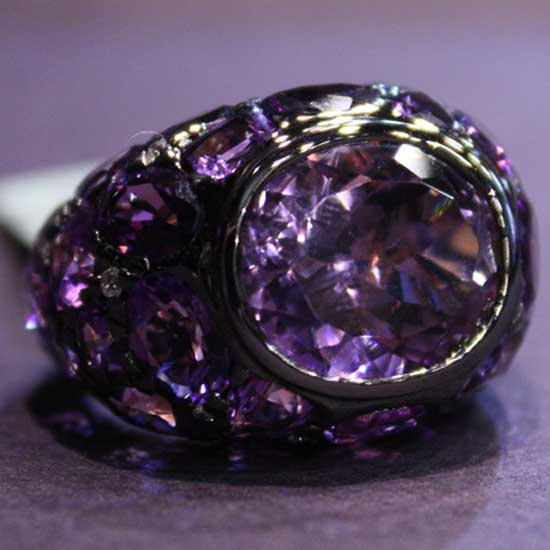 Add elegance to your jewelry box with the featured amethyst ring. Its band is made of red gold which makes the ring look more feminine. There is a big piece of amethyst in the middle with some smaller ones around it.